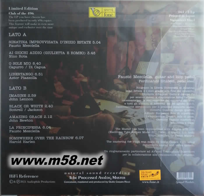 浮士托 梅索萊拉 [阿爾卡特拉斯歌舞廳現(xiàn)場實(shí)況]Fausto Mesolella Live Ad Alcatraz 黑膠 日本限量版(m58.net) 限量496張 天才橫溢,音樂天份極高的意大利結(jié)他演奏家、作曲家和編曲家浮士托‧梅索萊拉(Fausto Mesolella)從12歲首次接觸結(jié)他后便與此樂器結(jié)下了不解緣,使他在音樂路途踏上青云,贏得不少讚頌和稱譽(yù),他出色的指彈技巧和對(duì)音樂的熱情使他屢次被獲邀與國際著名音樂家包括加布里埃拉‧費(fèi)里(GabriellaFerri)、 安德烈•波切利(Andrea Bocelli)、保羅•康特(Paolo Conte)和弗朗西斯科‧特里卡里科(Francesco Tricarico)等合作演出,同時(shí)多次被邀在著名的圣雷莫音樂節(jié)(Festival di Sanremo)作示范演奏,其受專業(yè)界別的重視可想而知。梅索萊拉亦有自組樂隊(duì)「地中海(i Mediterranea)」作公開演出和錄製專輯,足跡遍及全歐洲及日本多地,極受歡迎。他亦曾為多套電影作配樂, 不少曾參加著名的電影節(jié)包括威尼斯影展,獲得好評(píng)如潮,奠定他在國際樂壇崇高的地位。2013年8日25日在意大利米蘭市最著名的阿爾卡特拉斯歌舞廳(Alcatraz)伙拍另一著名結(jié)他演奏家費(fèi)迪南道‧ 吉戴利(Ferdinando Ghidelli)合力演出一場精彩絕倫的演奏會(huì),他倆高超的指彈技術(shù)毋庸置疑,特別是吉戴利演奏的腳踏板鋼棒結(jié)他(pedal steel)和梅索萊拉的環(huán)踏板結(jié)他(loop pedal)更是令人瞠目結(jié)舌,拍案叫絕。這埸令人難忘的現(xiàn)場實(shí)況演出,現(xiàn)由以製作頂級(jí)錄音而馳名國際的「豐力(fone)」 其著名錄音師里茲(Giulio Cesare Ricci)採用經(jīng)由錄音界奇才大衛(wèi)‧曼尼(David Manley)修訂之模擬錄音系統(tǒng)(analogue recording)包括 採用Ampex ATR102兩軌盤式錄音座以1/2吋開盤磁帶,76/cm/sec轉(zhuǎn)速載原音源製作純模擬母盤, 分別配以180克、33轉(zhuǎn)單一階段式壓片(one-stage pressing)之黑膠盤與及專業(yè)的SACD為載體,將這經(jīng)典專輯以更完善美態(tài)呈獻(xiàn),是結(jié)他音樂鑑聽必然之選。