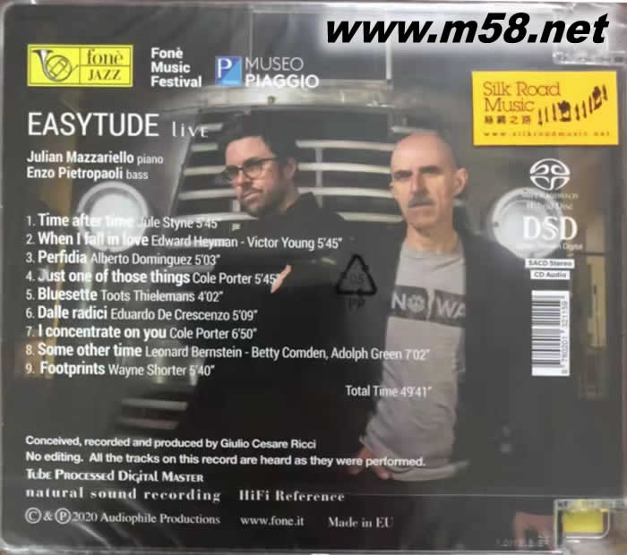 「比亞喬博物館」現場音樂會系列 - 輕松情調Live At Museo Piaggio - EASYTUDE Live (鋼琴與大提琴) SACD(m58.net) Julian Mazzariello (鋼琴) Enzo Pietropaoli (低音大提琴) 馬斯薩里爾羅鋼琴/皮埃特羅帕里低音大提琴SACD,鋼琴演奏行云流水,低音提琴色彩繽紛,演奏現場全情投入,里茲錄音! 1. 1978年出生於英國的意大利裔爵士樂鋼琴手朱利安.馬斯薩里爾盧(Julian Mazzariello)七歲開始習琴時已對「即興演奏」極感興趣。十七歲移居意大利后活躍於當地爵士樂壇,以彈奏流暢優雅,和聲精致見稱,特別是即興時的彈奏和其他樂手的互動,更是精彩萬分。 2. 恩佐.皮埃特羅帕里(Enzo Pietropaoli)出生於熱拿亞(Geona)而成長於羅馬(Rome),是現今意大利著名古典音樂和爵士樂低音大提琴手。在四十年的職業生涯,他到過歐洲、北美和南美、亞洲和非洲作巡迴演出,亦曾與多位著名爵士樂手合作,嫻熟優秀的琴技為他在爵士樂壇帶來不少榮譽,備受讚賞。 3. 馬斯薩里爾盧和皮埃特羅帕里兩人於2019年3月26日在意大利蓬泰德拉(Pontedera)「比亞喬奧博物館」(Museo Piaggio)大禮堂由意大利殿堂級錄音師里玆(Giulio Cesare Ricci)所創立的【豐力】唱片公司(fonè)所舉辦的音樂會使出渾身解數,落力表演,整個過程,精彩絕倫。 4. 「比亞喬奧(Piaggio)」是意大利著名摩托車生產商,其博物館內的大禮堂音響設計、設備和效果都非常出色,極為適合音樂會的演出和錄音用途。作為專業錄音師的里茲挑選這禮堂作為他旗下的歌星、樂手和樂隊的演出場地,一定是切合他對音響效果嚴格的要求。 5. 整個音樂會的演出盡顯馬斯薩里爾盧的彈奏緩慢時如小河淌水,急速時如潮拍海岸,琴音清脆明亮。皮埃特羅帕里的低音大提琴的拉奏動態十足,色彩繽紛的琴音如泣如訴地伴隨,兩位樂手全情投入,使出渾身解數,淋漓盡致地演繹九首精彩樂曲,加上里茲採用精巧的器材,負責由錄音至母盤製造整個製作過程,配合以SACD為載體,自然真實的空間感,晶瑩剔透的樂器音質,使人越聽越有味道。
