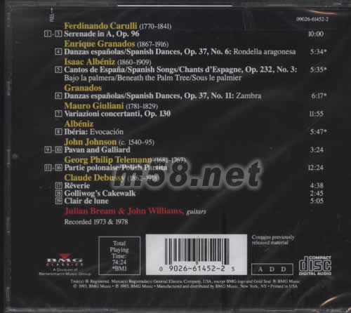ferdinando carulli(1770-1841) 1-3.serenade in a ,op.96 enrique granados(1867-1916) 4.danzas espanolas/spanish dances,op.37,no.6:rondella aragonesa isaac albeniz(1860-1909) 5.cantos de espana/spanish songs /chants d'espagne,op.232.no.3: bajo la palmera/beneath the palm tree /sous le palmier granados 6.danzas espanolas/spanish dances,op.37,no.11:zambra mauro giuliani(1781-1829) 7.variazioni concertanti,op.130 albeniz 8.ideria:evocacion joh johnson(c.1540-95) 9-10.pavan and galliard georg philip telemann(1681-1767) 11-16.partie polonaise /polish partita claude debussy(1862-1918) 17.reverie 18.golliwog's cakewalk 19.clair de lune julian bream & john williams,guitars
