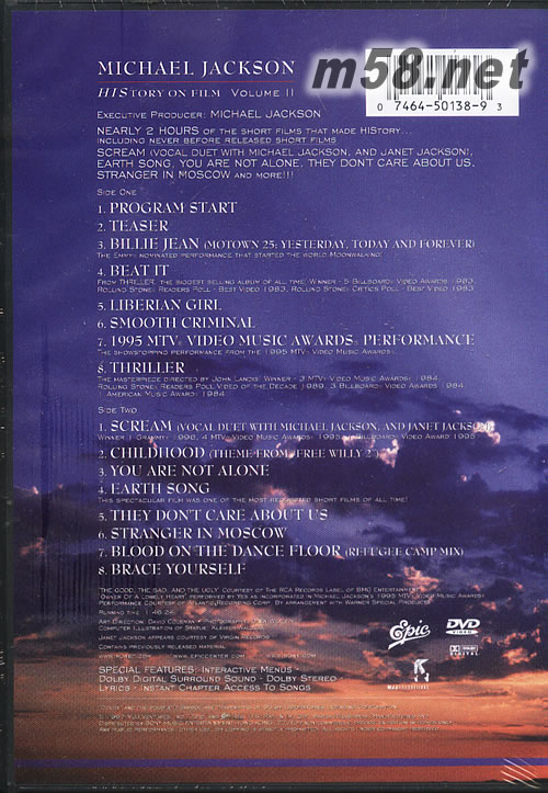 SIDE ONE 1.PROGRAMME START 2.TEASER 3.BILLIE JEAN(MOTOWN 25:YESTERDAY,TODAY AND FOREVER) 4.BEAT IT 5.LIBERLAN GIRL 6.SMOOTH CRLMINAL 7.1995 MTV VIDEO MUSIC AWARDS PERFORMANCE 8.THRILLER SIDE TWO 1.SCREAM(VOCAL DCET WITH MICHAEL JACKSON,AND JANET JACKSON) 2.CHILDHOOD(THEME FROM"FREE WILY 2) 3.YOU ARE NOT ALONE 4.EARTH SONG 5.THEY DON'T CARE ABOUT US 6.STRANGER IN MOSCOW 7.BLOOD ON THE DANCE FLOOR(REFUGEE CAMP MIX) 8.BRACE YOURSELF