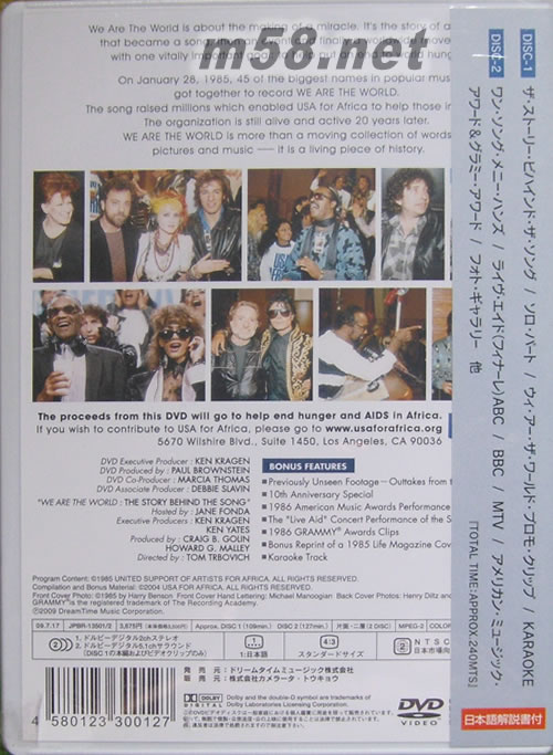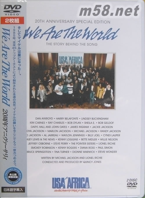 We Are The World.Michael Jackson.DVD(原裝日本版.限量) Michael jackson We Are the World歌曲全集+花絮 2005年歐美上市發售的新碟,收錄1985年歐美群星為了慈善演繹的《WE ARE THE WORLD》及制作全過程,全長達53分鐘。