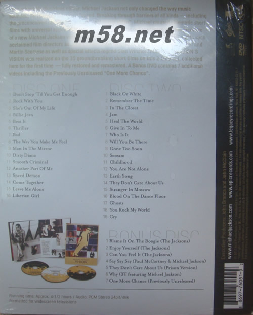 DVD規格 全區 2D9+1D5 無字幕 長度約4個半小時 1 -1 Don't Stop 'Til You Get Enough [DVD] 1 -2 Rock With You [DVD] 1 -3 She's Out of My Life (DVD首次收錄) [DVD] 1 -4 Billie Jean [DVD] 1 -5 Beat It [DVD] 1 -6 Thriller [DVD] 1 -7 Bad [DVD] 1 -8 The Way You Make Me Feel [DVD] 1 -9 Man in the Mirror [DVD] 1 -10 Dirty Diana [DVD] 1 -11 Smooth Criminal [DVD] 1 -12 Another Part of Me [DVD] 1 -13 Speed Demon [DVD] 1 -14 Come Together [DVD] 1 -15 Leave Me Alone [DVD] 1 -16 Liberian Girl [DVD] 2 -1 Black or White [DVD] 2 -2 Remember The Time [DVD] 2 -3 In the Closet [DVD] 2 -4 Jam [DVD] 2 -5 Heal the World [DVD] 2 -6 Give in to Me [DVD] 2 -7 Who Is It [DVD] 2 -8 Will You Be There [DVD] 2 -9 Gone Too Soon [DVD] 2 -10 Scream [DVD] 2 -11 Childhood [DVD] 2 -12 You Are Not Alone [DVD] 2 -13 Earth Song [DVD] 2 -14 They Don't Care About Us [DVD] 2 -15 Stranger in Moskow [DVD] 2 -16 Blood on the Dancefloor [DVD] 2 -17 Ghosts(DVD首次收錄) [DVD] 2 -18 You Rock My World (DVD首次收錄)[DVD] 2 -19 Cry (DVD首次收錄)[DVD] 3 -1 Blame It on the Boogie - The Jacksons (DVD首次收錄) DVD 3 -2 Enjoy Yourself - The Jacksons (DVD首次收錄) DVD 3 -3 Can You Feel It - The Jacksons (DVD首次收錄) DVD 3 -4 Say Say Say - Paul McCartney & Michael Jackson [DVD] 3 -5 They Don't Care About Us - Prison version (DVD首次收錄) DVD 3 -6 Why? - 3T featuring Michael Jackson (DVD首次收錄) DVD 3 -7 One More Chance - previously unreleased (DVD首次收錄) DVD