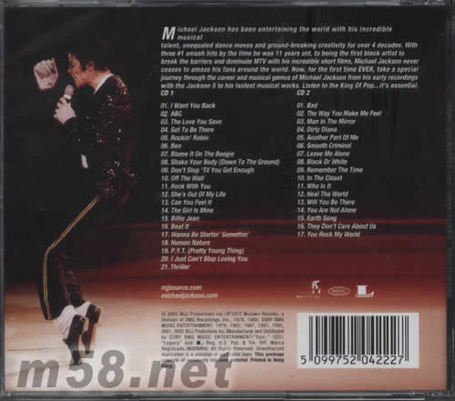 CD 1 1. I Want You Back 2. ABC 3. The Love You Save 4. Got To Be There 5. Rockin' Robin 6. Ben 7. Enjoy Yourself 8. Blame It On The Boogie 9. Shake Your Body (Down To The Ground) 10. Don't Stop 'Til You Get Enough 11. Rock With You 12. Off The Wall 13. She's Out Of My Life 14. The Girl Is Mine 15. Billie Jean 16. Beat It 17. Wanna Be Startin' Somethin' 18. Human Nature 19. P.Y.T. (Pretty Young Thing) 20. Thriller CD 2 1. Bad 2. I Just Can't Stop Loving You 3. Leave Me Alone 4. The Way You Make Me Feel 5. Man In The Mirror 6. Dirty Diana 7. Another Part Of Me 8. Smooth Criminal 9. Black Or White 10. Heal The World 11. Remember The Time 12. In The Closet 13. Who Is It 14. Will You Be There 15. Dangerous 16. You Are Not Alone 17. You Rock My World