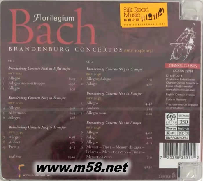 價格為估,以實到貨為準(zhǔn)! 巴哈 [布蘭登堡協(xié)奏曲BWN1046-1051] Bach Brandenburg Concertos SACD(m58.net) 由英國最頂尖的古樂合奏團群芳譜合奏團(Florilegium)配合阿希里指揮帶領(lǐng)合作演繹了巴哈6首[布蘭登堡協(xié)奏曲全集,以真正SACD發(fā)燒錄音制式制作,帶來最優(yōu)美典雅的旋律。