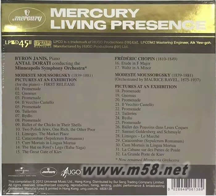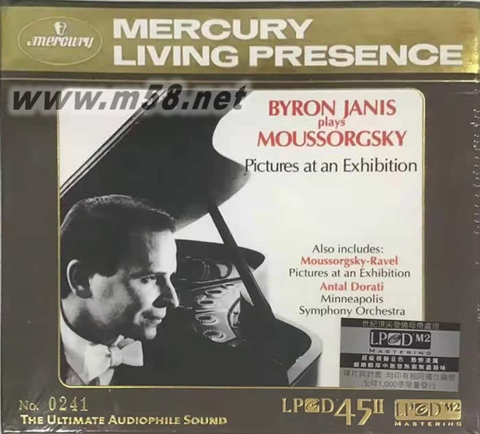 Byron Janis - Moussorgsky: Picture At An Exhibition 穆索爾斯基:畫展(LPCD 45 II )限量版(m58.net) MERCURY LIVING PRESENCE發行這張專輯《穆索爾斯基:圖畫展覽會》是著名的發燒經典,它的演奏者拜倫•賈尼斯(Byron Janis)1928年出生於美國,從小就表現出非凡的音樂天賦。 8歲時開始師從於大名鼎鼎的鋼琴家、教育家列文涅夫婦。 1943年,15歲的賈尼斯首次登臺,與美國NBC廣播交響樂團合作,成功地演奏了拉赫瑪尼諾夫的《第二鋼琴協奏曲》,自此拉開了他演奏生涯的帷幕。翌年,16歲的他與當時年僅14歲的洛林•馬澤爾指揮下的匹茲堡交響樂團再次合演了這一名曲。這場精彩的演奏讓觀眾席的一位特殊人物欣賞不已,那便是一代鋼琴大師霍洛維茨。從此霍氏便收賈尼斯為徒。儘管他師從霍洛維茨為時僅三年,但收益卻可謂事半功倍,終身受用。離開霍洛維茨之后,賈尼斯懷揣大師鋼琴藝術的衣缽,以新的姿態開始了一系列的世界性巡迴演出,全美所有大中城市、巴黎、莫斯科到處都留下他的足跡。他演繹的曲目幾乎均為浪漫派作曲家的作品。賈尼斯的琴藝相當完美,擁有準確敏銳的觸鍵、迷人詩意的氣息、富於動感的戲劇性張力。