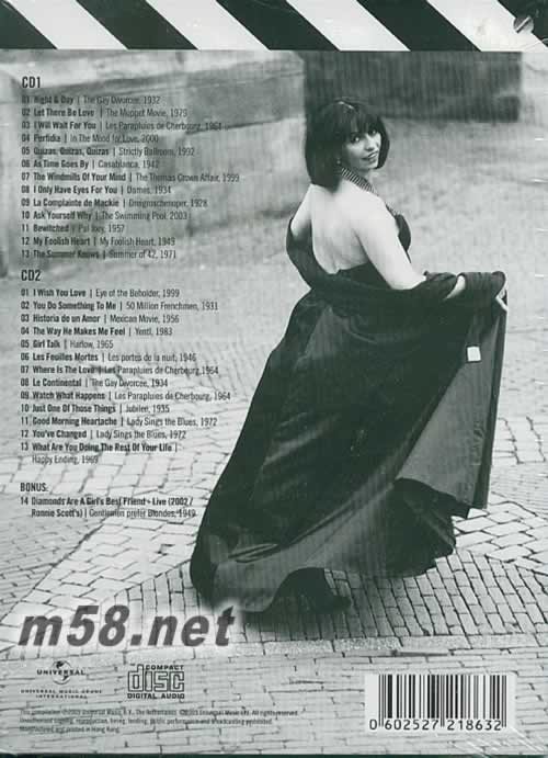 CD2 1.I wish you love (Eye of the beholder) 2.You do something to me (Cole Porter) (Musical 50 million Frenchmen) 3.Historia de un amor (Mexican Movie 1956) 4.The way he makes me feel (Yentl) 5.Girl Talk (Neal Hefti) (Film Harlow) 6.Les feuilles mortes (Les portes de la nuit) 7.Where is the love (Les parapluies de Cherbourg) 8.Le continental (The Gay divorcee 1934) 9.Just one of those things (Musical Jubilee 1935 Cole Porter) 10.Good morning heartache (Diana Ross, Lady sings the blues 1972) 11.You’ve changed (Lady sings the blues) 12.Good morning heartache (Diana Ross, Lady sings the blues 1972) 13.What are you doing (Happy ending) Bonus Track Diamonds Are A Girl's Best Friend (BONUS)