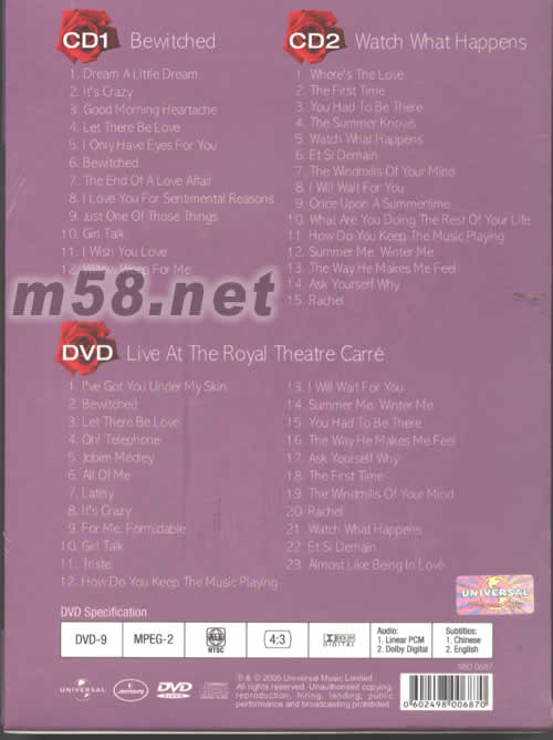 CD 1 BEWITCHED 1、DREAM A LITTLE DREAM 2、IT‘S CRAZY 3、GOOD MORING HEARTACHE 4、LET THERE BE LOVE 5、I ONLY HAVE EYES FOR YOU 6、BEWITCHED 7、THE END OF FOR SENTIMENTAL REASONS 9、JUST ONE OF THOSE THINGS 10、GIRL TALK 11、I WISH YOU LOVE 12、WILLOW WEEP FOR ME CD 2 WATCH WHAT HAPPENS 1、WHERE’S THE LOVE 2、THE FIRST TIME 3、YOU HAD TO BE THERE 4、THE SUMMER KNOWS 5、WATCH WHAT HAPPENS 6、ET SI DEMAIN 7、THE WINDMILLS OF YOUR MIND 8、I WILL WAIT FOR YOU 9、ONCE UPON A SUMMERTIME 10、WHAT ARE YOU DOING THE REST OF YOUR LIFE 11、HOW DO YOU KEEP THE MUSIC PLAYING 12、SUMMER ME WINTER ME 13、THE SAY HE MAKES ME FEEL 14、ADK YOURSELF WHY 15、RACHEL DVD LIVE AT THE ROYAL THEATRE CARRE 1、I‘VE GOT YOU UNDER MY SKIN 2、BEWITCHED 3、LET THERE BE LOVE 4、OH !TELEPHONE 5、JOBIM MEDLEY 6、ALL OF ME 7、LATELY 8、IT’S CRAZY 9、FOR ME FORMIDABLE 10、GIRL TALK 11、TRISTE 12、HOW DO YOU KEEP THE MUSIC PLAYING 13、I WILL WAIT FOR YOU 14、SUMMER ME ,WINTER ME 15、YOU HAD TO BE THERE 16、THE WAY HE MAKES ME FEEL 17、ADK YOURSELF WHY 18、THE FIRST TIME 19、THE WINDMILLS OF YOUR MIND 20、RACHEL 21、WATCH WHAT HAPPENS 22、ET SI DEMIAN 23、ALMOST LIKE BEING IN LOVE