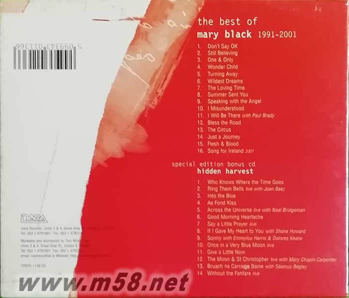 The Best of Mary Black 1991-2001(m58.net) 發燒友最喜愛的女聲MARY BLACD全新精選大碟,共收錄16首最經典金曲,首首經典名作,讓聽眾能一次過享受靚聲天后之優美歌聲。另首批附加特別版CD,共收錄14首重未出版過之作品,包括多首現場錄音片段,絕對珍貴,必成樂迷收藏之先。