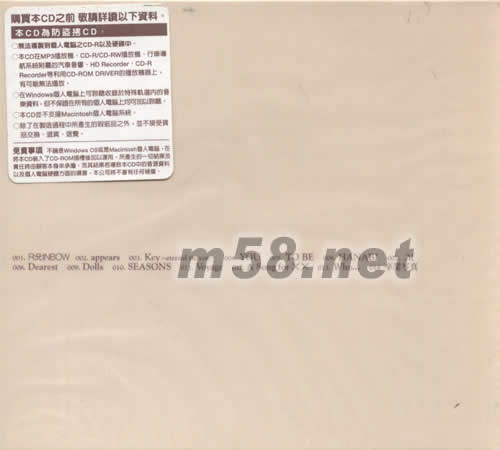 1、RAINBOW 2、APPEARS 3、KEY~ETERNAL TIE VER 4、YOU NOTHEN BREEZE 5、TO BE(2003 BEBIRTH MIX) 6、HANABI 7、M ORIGINAL MIX 8、DEAREST ORIGINAL MIX 9、DOLLS 10、SEASONS 2003 REBIRTH MIX 11、VOYGE 12、A SONG FOR XX 13、WHO ACROOSS THE NNIVERS 精美寫真