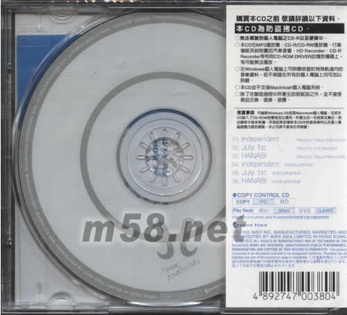 1、INDEPENDENT/日本實況棒球節目 2、JULY 1ST /日本KOSE化妝品系列 3、HANABI(火花)/日本流動通訊公司 4、INDEPENDENT--INSTRUMETAL 5、JUST 1ST-INSTRUMENTAL 6、HANABI-INSTRUMENTAL