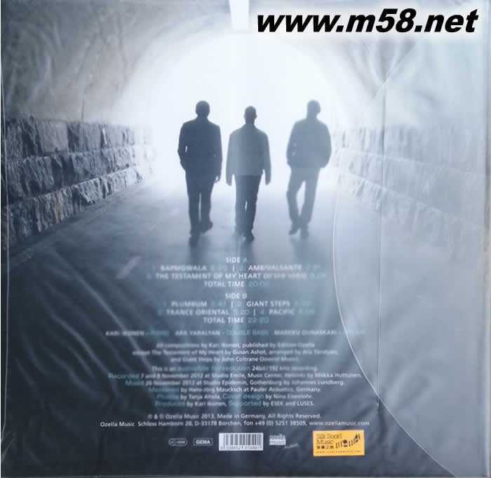 Bright 明亮 爵士鋼琴三重奏(鋼琴、大提琴、鼓) 黑膠(m58.net) 卡里.伊科寧(Kari Ikonen) 是芬蘭現今最杰出的爵士音樂家之一,他的卡里克科六重奏(Karikko Sextet)蜚聲國際,飲譽全球。伊科寧本身是鋼琴家,鍵盤樂器演奏家和作曲家,他的作品絕不艱深難明但需要高水平的演奏技巧演繹,旋律有流行曲的元素,容易使人接受但不流於庸俗,加上他出息的琴技,不少國際知名的音人喜歡與他合作,特別是演出他的作品,其中巴括英格麗.延森(Ingrid Jensen)、鮑勃.摩西斯(Bob Moses)、馬格努斯.布奧、文森特.庫爾圖瓦斯(Vincent Courtois)和羅恩.麥克盧爾(Ron McClure)等,而他的作品亦榮獲美國朱利葉斯.亨普希爾作曲獎(Juliud Hemphill Composition Awards (USA)第一名和意大利爵士樂作曲(Italian Scrivere in Jazz)一等獎,其音樂造詣之高,可想而知。他近年伙拍國際知名的低音大提琴手艾拉‧ 雅拉利安(Ara Yaralyan)及鼓手馬克庫‧ 奧細塞卡里(Markku Ounaskari)組成卡里‧伊科寧三重奏(Kari Ikonen Trio),除了作巡迴演出外,亦從事專輯錄音,他們的首張作品剛好面世,三人使出渾身解數,全情投入地演繹伊科寧的多首精彩作品包括【Bapmgwala】、【Ambivalsante(矛盾)】、【The Testament Of My Heart(我心中的遺愿)】、【Plumbum(鉛)】、【Giant Steps(巨大的步履)】、【I Fall In Love Too Easily(我太容易墮入愛情)】、【Trance Oriental(東方夢想)】及【Pacific(太平洋)】等,最重量級的組合演繹最出息的作品,加上以180克33 1/3轉處女黑膠為載體,金刻直刻母盤由「老虎魚」錄音室專責處理,純模擬聲效,音色更為自然和暖,創造了一張令人完全信服的爵士樂示范盤。