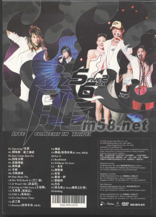 價格為估,以實到貨為準! 登峰造極亞洲巡回演唱會龍臺北站DVD(m58.net) 演唱會的開場由舞臺的聲光效果呈現群魔亂舞混亂的空間感,由5566成員協志、 仁甫、紹為、孟哲四人化身戰神現身分,別手持弓箭、長杖、 斧頭與長劍現身,霎時引起了第一波的高潮,四人精湛的舞蹈與歌聲征服了現場近二萬名的歌迷,在整體效果的呈現上由師弟太極kone R&B 配合第一首歌《easy come easy go》的節奏,在舞臺上整齊劃一的表演,著實可媲美日本杰尼斯的表演,整個舞臺約容納了近50位dancer,由5566四位成員帶領著揭開序曲。 接下來分別演唱《四度空間》、《愛情漫游》,其中為了突顯舞蹈,四位成員舞蹈大對決,直接在浩大的舞臺上尬舞,如此的舉動惹的全體尖叫四起,讓大家懾服他們的舞蹈真是出神入化,在個人表演 的部分,率先由仁甫領軍出場演唱we will rock u,高危險度的吊鋼絲,高度近一層樓高,配合著華利的演出服魅力四射,接棒的是孟哲 it wasn’t me ,他乘著奔馳銀色敞篷車出場 ,化身富家白馬王子,呼應了現在所演出《愛上千金美眉》的劇情,接著登場的是紹偉的個人秀,演唱歌曲為Living La vita Loca,服裝表現為化身八號當鋪的復古中國風,壓軸的是協志反串秀,身著海灘服與蛙鞋水槍,讓全場的小朋友看的目瞪口呆。 在服裝部分,光是5566成員的部分一連換了八套服裝 ,舞臺上的變化道具一共有五十多種變化之多 ,加上太極、kone、r&b、此次的dancer之多,整場演唱會的服裝高達200多套,其中每段的vcr 都精心設計,例如協志的部分,本完全不會游泳的他,而且怕水到了極點的他,為了此場演唱會克服了怕水的恐懼,淺下了游泳池,去找出深達近二公尺深的高度,取出了原本的牌子抽出了幸運歌迷。