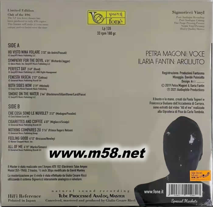 4. 瑪戈妮的歌聲線嬌柔中帶點風霜,溫婉中帶著青澀,極具韻味,加上芳婷那輕柔儒雅,如影隨形般的魯特琴伴奏,竟然產生意想不到的絕美效果,她倆融為一體的演繹使每首歌曲都使人聽得如癡如醉。 5. 母盤製造工序整個過程採用純模擬器材製作,由著名錄音師里茲(Giulio Cesare Ricci)親自操刀,期間不作任何加強、調整和更改(one-stage pressing process),是純自然錄音格式(natural sound recording)的錄音內容,配以33 1/3轉180克超自然色透明膠唱片為載體,壓片製作工序則由日本著名黑膠盤製造商負責,重播的音質和音效與原來模擬對比錄音母盤幾乎完全相同。自然立體的人聲,清晰淳厚,音色美絕,魯特琴音質厚實,線條分明,歌唱與琴音定位清晰,音場寛廣。顯赫的錄音技術,爐火純青的演唱,絲絲入扣的伴奏,展現充滿誘人魅力的聲音美感。全球限量496張,極為珍貴。