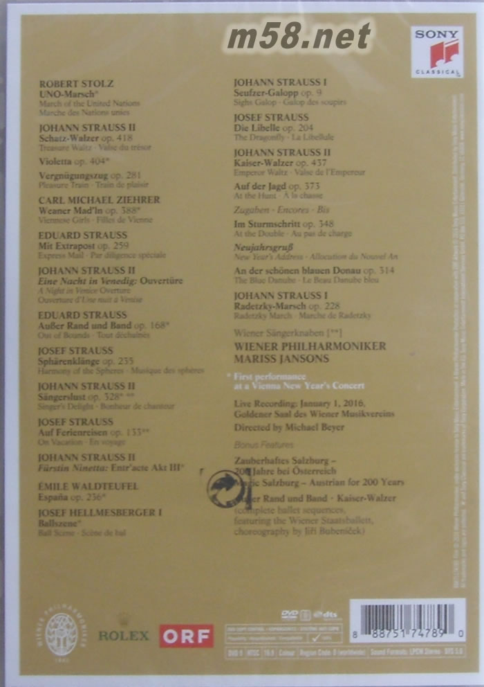 2016年維也納新年音樂(lè)會(huì) - 在舞蹈慶典中穩(wěn)步發(fā)展 /New Year's Concert 2016 DVD(m58.net) 全球聚焦的最重要年度音樂(lè)盛事,第七十五屆維也納新年音樂(lè)會(huì)耀眼登場(chǎng)。 大師楊頌斯三元及第,繼2006、2012,2016第三度榮膺年度指揮家。 「聯(lián)合國(guó)進(jìn)行曲」輝煌開(kāi)場(chǎng),維也納少年合唱團(tuán)闊別四年后再度獻(xiàn)唱。 八位作曲家二十一首演出曲目完整收錄,包含八首初登場(chǎng)嶄新樂(lè)曲。 索尼音樂(lè)隆重發(fā)行CD、DVD、藍(lán)光與黑膠唱片,為慶祝七十五週年並推出23CD【新年音樂(lè)會(huì)全記錄】豪華珍藏版。 全世界矚目的維也納新年音樂(lè)會(huì),2016年元旦隆重迎接第七十五屆的到來(lái)!回首這橫跨四分之三世紀(jì)的輝煌盛事,從1939年第一屆於維也納金色大廳舉辦,透過(guò)電視電臺(tái)轉(zhuǎn)播與影音商品發(fā)行,成為婦孺皆知、雅俗共賞的慶典活動(dòng)。而自1987年卡拉揚(yáng)之后,每年由誰(shuí)擔(dān)任指揮,更是樂(lè)迷津津樂(lè)道的話(huà)題,今年適逢七十五週年里程碑,維也納愛(ài)樂(lè)邀請(qǐng)楊頌斯三度榮膺年度指揮家。 細(xì)數(shù)七十五年的悠久歷史,僅十五位指揮家能夠擔(dān)任年度指揮家,除了早期的克勞斯和鮑斯考夫斯基,只有馬捷爾、祖賓梅塔、慕提超越楊頌斯的紀(jì)錄。今年七十三歲的楊頌斯出生於拉脫維亞,他與維也納愛(ài)樂(lè)之淵源首次建立於1992年,2006年第一次指揮維也納新年音樂(lè)會(huì)。而為了慶祝雙方合作二十週年,2012年再度邀請(qǐng)楊頌斯擔(dān)任年度指揮家,媒體推崇為「音樂(lè)的偉大時(shí)刻」。 2016年三元及第,楊頌斯與維也納愛(ài)樂(lè)開(kāi)出令人期待的八位作曲家二十一首曲單,其中包含八闕首次演出的嶄新曲目。揮別2015年的紛亂,第一首便是首次登場(chǎng)的《聯(lián)合國(guó)進(jìn)行曲》,這是致力延續(xù)圓舞曲與輕歌劇白銀時(shí)代的奧國(guó)作曲家史托茲所作;同時(shí)初登場(chǎng)被稱(chēng)為「法國(guó)史特勞斯」的華德托菲之《西班牙圓舞曲》。而好幾年屢屢出現(xiàn)的小約瑟夫.赫爾梅斯貝格,他父親老約翰也終於首次登上新年音樂(lè)會(huì),用《舞會(huì)場(chǎng)景》呈現(xiàn)維也納美好時(shí)代的歌舞氛圍。 本屆維也納新年音樂(lè)會(huì),「史特勞斯王朝」四位偉大作曲家亦全員到齊,除了壓軸的《藍(lán)色多瑙河》及《拉德斯基進(jìn)行曲》外,還包括經(jīng)典《皇帝圓舞曲》、《天體音樂(lè)》、《威尼斯之夜》序曲等,小約翰的《侯爵夫人妮涅塔》間奏曲也首次出場(chǎng)。而為了紀(jì)念家族最小成員愛(ài)德華逝世一百週年,則安排了他的《特快郵件》及《失控》兩首快速波卡。 猶記得四年前的維也納新年音樂(lè)會(huì),楊頌斯請(qǐng)來(lái)頂尖的維也納少年合唱團(tuán)共同參與,本屆亦再次邀請(qǐng)這天籟美聲團(tuán)體演唱《歌手愿望》與《旅游假期》兩首波卡舞曲。再加上楊頌斯的指揮風(fēng)格,永遠(yuǎn)充滿(mǎn)令人驚嘆的熱情和活力,總能讓樂(lè)迷留下鮮明印象,在此「鉆石紀(jì)念」的第七十五屆新年音樂(lè)會(huì),大師與維也納愛(ài)樂(lè)又創(chuàng)下音樂(lè)史上的偉大時(shí)刻!