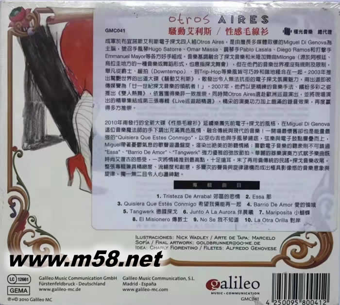 TRICORA(m58.net) 成軍於布宜諾斯艾利斯電子探戈四人組OtrosAires,是由擅長多媒體取樣的Miguel Di Genova為主腦,號(hào)召手風(fēng)琴Hugo Satorre、Omar Massa、鋼琴手Pablo Lasala、Diego Ramos和打擊手Emmanuel Mayor等各方好手組成。音樂基調(diào)融合了探戈音樂和米隆加舞曲Milonga(源於阿根廷、烏拉圭地方的一種音樂或舞蹈形式,也意指探戈舞會(huì)),但在他們的音樂世界里沒有規(guī)則及限制,舉凡從爵士、緩拍(Downtempo)、到Trip-Hop等樂風(fēng)皆可巧妙和諧地糅合在一起。2003年推出驚艷世界的出道大碟《騷動(dòng)艾利斯》,散發(fā)出令人無法抗拒的電子探戈氛圍魅力,甫出道即被傳媒譽(yù)為「廿一世紀(jì)探戈音樂的領(lǐng)航者!」。2007年,他們以更精練的音樂手法、繽紛多彩之姿推出《雙人熱舞》,依舊獲得樂評(píng)一致好評(píng)。 每回進(jìn)化總令樂迷驚呼傳媒讚嘆的Otros Aires,成軍至今不斷嘗試融入更多電子節(jié)奏以及探戈元素,2007年遠(yuǎn)赴歐洲巡迴演出后精華集結(jié)而成的第三張專輯《Live巡迴超精選》,試圖將前兩張專輯暢銷作品結(jié)合並重新編曲,賦予嶄新的音樂生命。開場三首熱力四射,改編自探戈歌王Carlos Gardel的作品“Milonga Sentimental”、“Sin Rumbo”和“Rotos En El Raval”一波波畫龍點(diǎn)睛令人屏息的電氣節(jié)奏LOOP與綿密的演唱情緒醞釀出細(xì)膩而美妙的新探戈情境詩篇,再再令人陶醉不已;喜愛緩拍與拼貼型態(tài)節(jié)奏的樂迷則不可錯(cuò)過“Allerdings Otros Aires”、 “Amor Que Se Baila”和“Barrio De Tango”,一直到結(jié)尾特別加收混音版本“Allerdings Otros Aires”展現(xiàn)了Miguel Di Genova操盤混音的絕佳功力。這是一場絕無冷場的新世紀(jì)時(shí)尚探戈饗宴,一張打破音樂界線再生混種新文化的作品,以O(shè)tros Aires標(biāo)幟性的強(qiáng)大創(chuàng)作手法,讓樂迷用耳朵親自體驗(yàn)從中併發(fā)的無限感動(dòng),《Live巡迴超精選》充滿了精彩的戲劇張力,精采的演奏功力加上飽滿的錄音效果,再度贏得多方推崇。