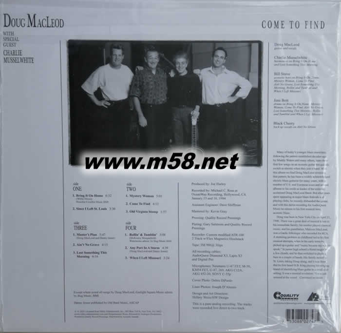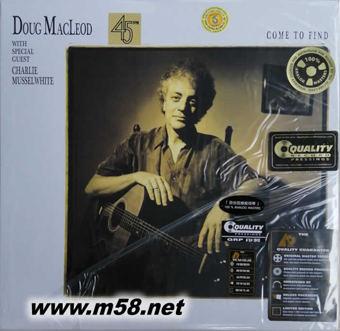 鄉村藍調 Come To Find 200克45轉 雙黑膠(m58.net) 美國鄉村藍調樂界著名翹楚,溫暖靈魂的吉他與醇厚嗓音,大師級的完美演出,獻上完美音樂體驗! 1947 年生於紐約的道格.麥克李歐,不僅僅是個藍調歌手,更是一位創作歌者、也是個說故事的人; 他早年便在美國境內多次遷徙,獨自過著旅行與漫游的生活,這些經歷都成為他用藍調講述生命故事的題材;The Absolute Sound 對他讚譽有加:「這位說故事的大師,擅長探索音符之間的空隙,沈靜而內斂地展現三角洲藍調的神祕傳統。」他那溫厚、充滿靈魂的嗓音,加上出神入化的藍調吉他,彷彿能奏出音符之間的音符,都使他成為當今藍調樂界最頂級的代表人物,他發行的約二十張專輯作品,重新演繹許多經典藍調歌曲與親身創作,不僅內容精采、音樂價值極高,同時也都有著頂級的錄音效果,不僅人聲渾厚有力,透明清澈的鋼弦吉他更是聲聲扣人心弦,后排合音則是充滿了立體層次、展現絕佳空間感,是音響玩家爭相收藏的對象。