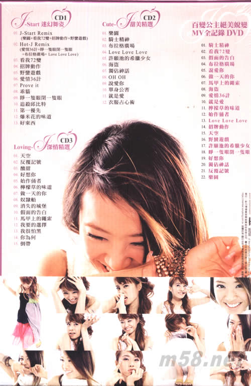 CD 1 J-Start 迷幻舞姿 01. J-Start Remix(樂園+看我72變+招牌動作+野蠻游戲) 02. Hot-J Remix(愛情36計+睜一只眼閉一只眼+布拉格廣場+Love Love Love) 03. 看我72變 04. 招牌動作 05. 野蠻游戲 06. 愛情36計 07. Prove it 08. 乖貓 09. 睜一只眼閉一只眼 10. 追殺邱比特 11. 第一優先 12. 爆米花的味道 13. 好東西 CD 2 Cute-J 甜美精選 01. 樂園 02. 騎士精神 03. 布拉格廣場 04. Love Love Love 05. 許愿池的希臘少女 06. 海盜 07. 獨占神話 08. OH OH 09. 說愛你 10. 單身公害 11. 就是愛 12. 衣服占心術 CD 3 Loving-J 深情精選 01. 天空 02. 反覆記號 03. 酸甜 04. 好想你 05. 始作俑者 06. 檸檬草的味道 07. 做一天的你 08. 奴隸船 09. 消失的城堡 10. 假面的告白 11. 馬甲上的繩索 12. 我要的選擇 13. 我很怕黑 14. 你為何 15. 倒帶 百變公主絕美蛻變 MV全記錄DVD 01. 騎士精神 02. 看我72變 03. 假面的告白 04. 布拉格廣場 05. 說愛你 06. 做一天的你 07. 馬甲上的繩索 08. 海盜 09. 愛情36計 10. 就是愛 11. 檸檬草的味道 12. 始作俑者 13. Love Love Love 14. 招牌動作 15. 天空 16. 野蠻游戲 17. 許愿池的希臘少女 18. 睜一只眼閉一只眼 19. 好想你 20. 獨占神話 21. 反覆記號 22. 樂園