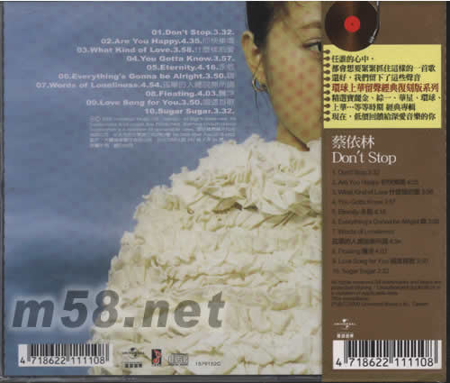 Don‘t Stop(留聲經典復刻版系列)(m58.net) 任誰的心中, 都會想要緊緊抓住這樣的一首歌, 還好,我們留下了這些聲音。 環球上華留聲經典復刻版系列 精選寶麗金、綜一、華星、環球、上華...等等時期 經典專輯。 現在,低價回饋給深愛音樂的你。