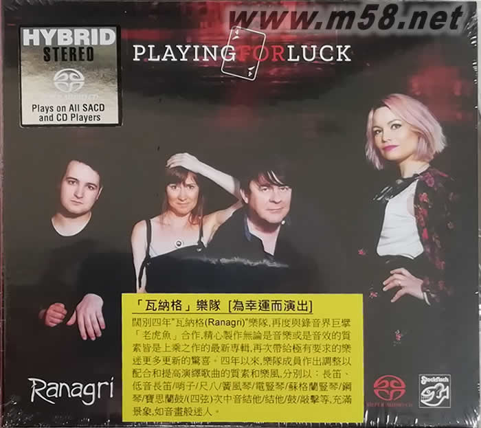 瓦納格樂隊 為幸運而演出Ranagri [Playing For Luck] SACD 老虎魚(m58.net) 1. 繼2014年首張專輯【野兔的堡壘(Fort Of The Hare)】獲得不少專業樂評和一眾樂迷擊節讚賞,「瓦納格(Ranagri)」樂隊再度與錄音界巨擘「老虎魚」合作,精心製作無論是音樂或是音效的質素皆是上乘之作的最新専輯【為幸運而演出(Playing For Luck)】,再次帶給極有要求的樂迷更多更新的驚喜。 2. 四年以來,樂隊成員作出調整以配合和提高演繹歌曲的質素和樂風,結他手,亦是主音歌手的多納爾.羅杰斯(Donal Rogers)和負責長笛、低音長笛、哨子演奏的伊麗莎.馬歇爾(Eliza Marshall)仍是樂隊骨干成員,而新加入的是獲得多個國際音樂獎項的豎琴演奏家埃莉諾.特納(Eleanor Turner))和負責寶思蘭鼓(bodhran)和敲擊演奏的喬.丹克斯(Joe Danks),他們出色的演奏技巧和心意相通的默契在新的專輯表露無遺。 3. 多納爾.羅杰斯曾到不少國家和地區游歷,人生閲歷無數,目睹不少真實發生,趣味盎然的人與事,他將其所見所聞混和錯綜復雜的民間音樂及加入了神秘、典雅、精巧和富點藝術性的元素,融入其所作的樂曲之中,現由他親自演唱這些出色的作品,可聽性更高。 4. 馬歇爾輕柔婉約,跳躍有序的長笛吹奏,配合特納那優雅飄逸,清心悅耳的豎琴琴音和丹克斯令人振奮,充動力的敲撃,加上羅杰斯清澈嘹亮的歌聲,將每一首樂曲演繹得充滿景象,如音畫般迷人。