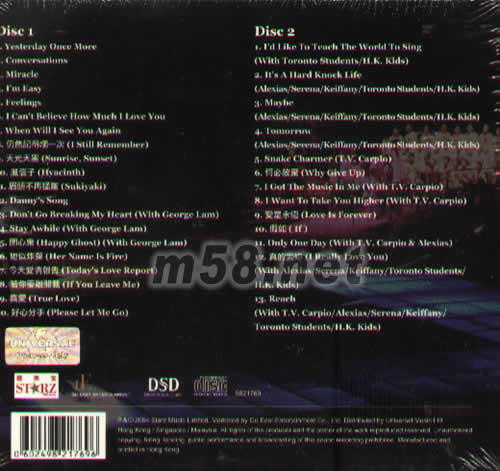 Disc 1 01. Yesterday Once More 02. Conversations 03. Miracle 04. I m Easy 05. Feelings 06. I Can t Believe How Much I Love You 07. When Will I See You Again 08. 仍然記得嗰一次(I Still Remember) 09. 天光天黑(Sunrise,Sunset) 10. 風(fēng)信子(Hyacinth) 11. 眉頭不再猛皺(Sukiyaki) 12. Danny s Song 13. Don t Go Breaking My Heart(With George Lam) 14. Stay Awhile(With George Lam) 15. 開心鬼(Happy Ghost)(With George Lam) 16. 她似炸彈(Her Name Is Fire) 17. 今天愛情報(bào)告(Today s Love Report) 18. 若你要離開我(If You Leave Me) 19. 真愛(True Love) 20. 好心分手(Please Let Me Go) Disc 2 01. I d Like To Teach The World To Sing(With Toronto Students/H.K.Kids) 02. It s A Hard Knock Life (Alexias/Serena/Keiffany/Toronto Students/H.K.Kids) 03. Maybe(Alexias/Serena/Keiffany/Toronto Students/H.K.Kids) 04. Tomorrow(Alexias/Serena/Keiffany/Toronto Students/H.K.Kids) 05. Snake Charmer(T.V.Carpio) 06. 何必放棄(Why Give Up) 07. I Got The Music In Me(With T.V.Carpio) 08. I Want To Take You Higher(With T.V.Carpio) 09. 愛是永恒(Love Is Forever) 10. 假如(If) 11. Only One Day(With T.V.Carpio & Alexias) 12. 真的愛你(I Really Love You) (With Alexias/Serena/Keiffany/Toronto Students/H.K.Kids) 13. Reach(With T.V.Carpio/Alexias/Serena/Keiffany/Toronto Students/H.K.Kids)