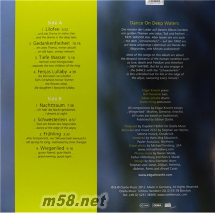 劉漢盛榜單 - 在水深處舞動 Dance on Deep Waters 180g 33RPM LP 黑膠(m58.net) 音響論壇總編輯劉漢盛「復刻黑膠嚴選 100」強力推薦! ★ 獲獎無數(shù)、德國當今最具天份與創(chuàng)意的爵士鋼琴演奏家! ★ 精簡深邃的美麗旋律,描繪出人類最深層的慾望與愛戀! ★ 名廠Ozella出品、老虎魚操刀后制,音響迷的最佳饗宴! 埃德加.尼赫特 ( Edgar Knecht ) 是德國現(xiàn)今最具音樂天份和創(chuàng)意的鋼琴爵士樂的演奏家和作曲家,他從 14 歲開始公開演奏自己的作品,獲得好評如潮,踏上青云之路,跟著獲獎無數(shù),但他利用自己獨有的天才,以他的音樂作為親善大使,到多國演出以傳遞友愛的信息。他曾為多部音樂劇、電影和電視紀錄片作曲和配樂,極受歡迎,而他最為人稱頌的是改編多首德國民歌以鋼琴爵士樂演奏并在古巴夏灣拿的爵士樂音樂節(jié)中大放異彩,贏得無盡掌聲和喝采。他伙拍著名的低音大提琴手羅爾夫‧丹歷克 ( Rolf Denecke )、鼓手斯蒂芬‧埃米格 ( Stephan Emig ) 和托比亞斯‧舒爾特 ( Tobias Schulte ) 組成的爵士樂隊作經常性演出,因他們技術出眾,演奏樂曲旋律精潔動人,贏得樂迷一致讚賞。 他們的最新專輯【在水深處舞動】是描繪人類最關懷的愛情、死亡和自由,不少人在慾望的深淵邊緣肆無忌憚地生活於每一分鐘,專輯內的歌曲就是細訴這種情況和生態(tài),當你細聽專輯中的每一首歌曲時,便可細味個中精髓。此錄音制作由德國著名錄音師戴戈貝治.伯姆 ( Dagobert Bohm ) 精心泡制,而后期母盤由老虎魚操刀,以 1:1 直刻母盤、180克完全德國制造之黑膠唱片,音效達至完美水平,是另一鋼琴爵士樂的示范盤。