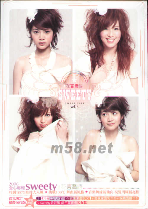 花言喬語(yǔ)(首批限定精裝保存版)(m58.net) 大小:長(zhǎng):20cm 寬:28cm 高:2cm 特調(diào)100%娃娃大人風(fēng)挑100℃ 舞曲新風(fēng)格音樂(lè)舞漾新曲向視覺(jué)閃耀新亮相 首批限定 淘氣 1.水平衡美肌旅行組 女生潔面乳*1男生潔面乳*1+保濕面膜*1 精裝保存版 附錄 2.Sweety娃娃風(fēng)成年宣言卡*6款