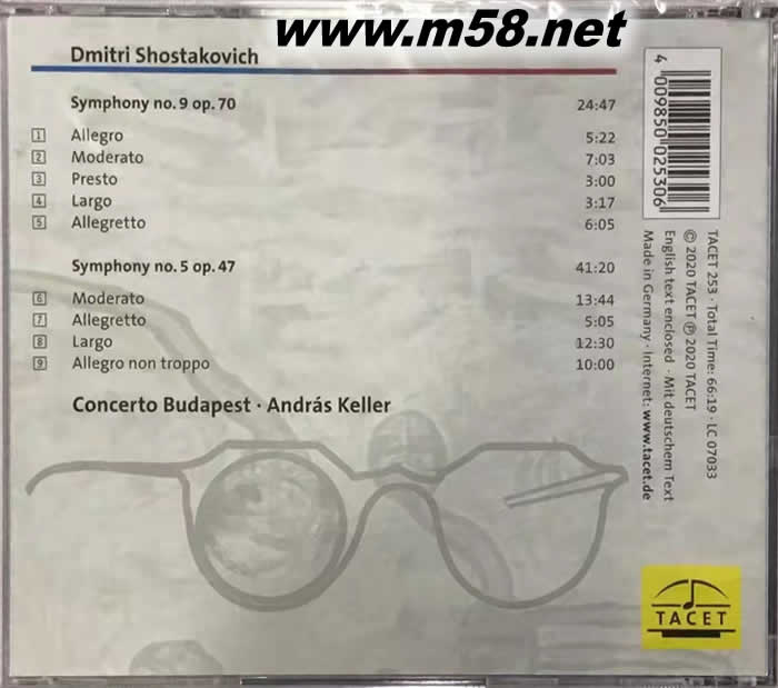 肖斯塔科維奇 第五 九號交響曲 Dmitri Shostakovich : Symphony No.9 Op.70 ; Symphony No.5 Op.47(m58.net) 安德拉斯凱勒以小提琴家和凱勒四重奏的創始人而聞名,並擔任布達佩斯協奏曲樂團的導演和指揮。布達佩斯協奏曲樂團(Concerto Budapest)是匈牙利歷史最悠久的樂團之一,擁有100多年的歷史,2007年,在其成立100週年之際,安德拉斯凱勒,世界著名的匈牙利小提琴家,被任命為樂團的藝術總監和首席指揮,在他的領導下,布達佩斯協奏曲成為最受尊敬的匈牙利巡迴樂團。布魯克納第九號交響曲,指揮大師福特萬格勒稱其為「圣曲」,之所以廣受注目的原因之一:它是布魯克納的最后遺作,其二則是樂曲極為吸引人,聽眾總被其宏偉與神秘性所折服,可惜布魯克納卻來不及完成最終樂章。 本專輯為TACET第一張布魯克納作品的錄音,也代表了指揮安德拉斯凱勒,布達佩斯協奏曲樂團和TACET新合作關係的開始,凱勒和樂團精彩的詮釋透過TACET高品質錄音技術完美呈現給聽眾。