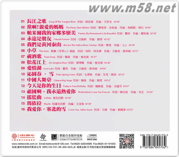 01 長江之歌 Song Of The Yangtze River 02’56” 作詞:胡宏偉 作曲:王世光 02 黨啊!親愛的媽媽 The Party, Dear Mother 03’05” 作詞:龔愛書、余致迪 作曲:馬殿銀、周右 03 帕米爾我的家鄉(xiāng)多么美 Pamirs, My Hometown Is So Beautiful 03’58” 作詞:瞿琮 作曲:鄭秋風 04 永遠是朋友 Friends Forever 03’22” 作詞:任衛(wèi)新 作曲:劉青 05 我們是黃河泰山 We Are The Yellow River, Taishan 04’18” 作詞:曹勇 作曲:士心 06 小草 The Grass 02’31” 歌劇《芳草心》插曲 作詞:何彤、何兆華 作曲:王祖皆、張卓婭 07 祝酒歌 Toast Song 02’51” 作詞:韓偉 作曲:施光南 08 松花江上 On Songhua River 03’20” 作詞:張寒暉 作曲:施光南 09 愛情湖 Love Lake 04’56” 作詞:瞿琮 作曲:王祖皆、張卓婭 10 沁園春 ·雪 Patio Spring, Snow 03’32” 作詞:毛澤東 作曲:生茂、唐詞 11 中國大舞臺 Chinese Big Stage 03’52” 作詞:韓偉 作曲:劉青 12 今天是你的生日 Today Is Your Birthday 04’37” 作詞:韓靜霆 作曲:穀建芬 13 祖國啊,我永遠熱愛你 Motherland, I Love You Forever 03’24” 作詞:劉合莊 作曲:李正 14 搖籃曲 Lullaby 02’43” 東北民歌 15 瑪依拉 Mayila 03’38” 哈薩克民歌 改編:王洛賓 16 我愛你,塞北的雪 I Love You, Saibei Snow 02’53” 作詞:王德 作曲:劉錫津
