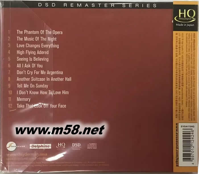 鋼琴演奏韋伯經(jīng)典音樂劇歌曲 HQCD(m58.net) 理查德·克萊德曼在鋼琴上最流暢、最精彩的演奏,將韋伯的作品迷住。 《安德魯·勞埃德·韋伯的情歌》是一張錄音室專輯,收錄了7部安德魯·勞埃德·韋伯音樂劇的12首歌曲,包括《歌劇魅影》和《埃維塔》。 這張專輯已經(jīng)在世界各地以多種形式發(fā)行,如《安德魯·勞埃德·韋伯之最》和《理查德·克萊德曼之面》。 在歐洲利用DSD(直達(dá)流數(shù)字)技術(shù)重新錄制,增強(qiáng)了這些經(jīng)典錄音的美妙聲音,讓發(fā)燒友們能聽到美妙的聲音,許多曲目現(xiàn)在都是克萊德曼經(jīng)典曲目。 由奧利維爾·圖桑構(gòu)思和編排,保羅·德·塞內(nèi)維爾和奧利維爾·圖桑制作,這是一部真正的經(jīng)典杰作。