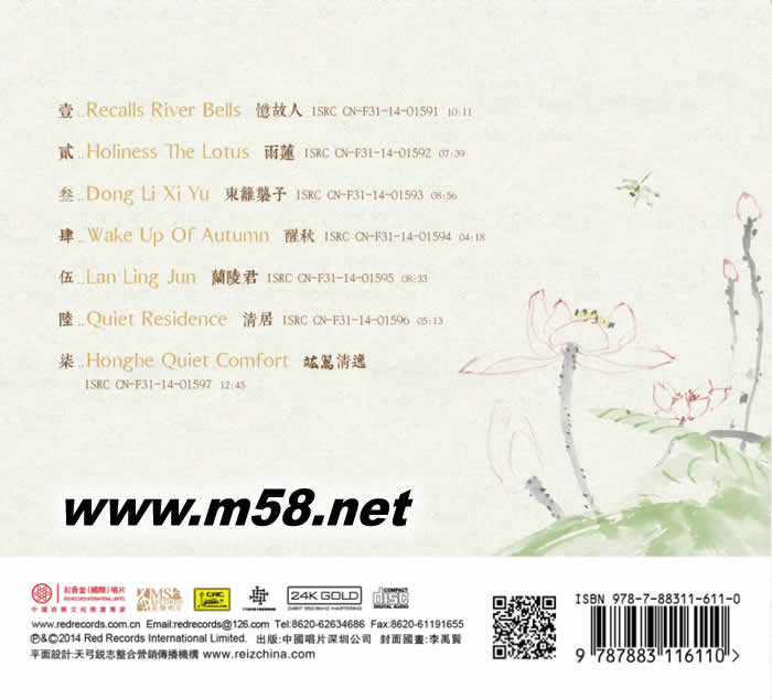 壹.. 憶故人 10:11 Memories Forever ISRC CN-F31-14-01591 貳.. 雨蓮 07:39 The Nenuphar in the Rain ISRC CN-F31-14-01592 叁.. 東籬襲予 08:56 Touched By Your Hermit-like Bearing ISRC CN-F31-14-01593 肆.. 醒秋 04:18 Pure Autumn ISRC CN-F31-14-01594 伍.. 蘭陵君 08:33 Lanling Jun ISRC CN-F31-14-01595 陸.. 清居 05:13 Live a Free Life in the Forest ISRC CN-F31-14-01596 柒.. 竑翯清逸 12:45 Flying Out of the Sky ISRC CN-F31-14-01597
