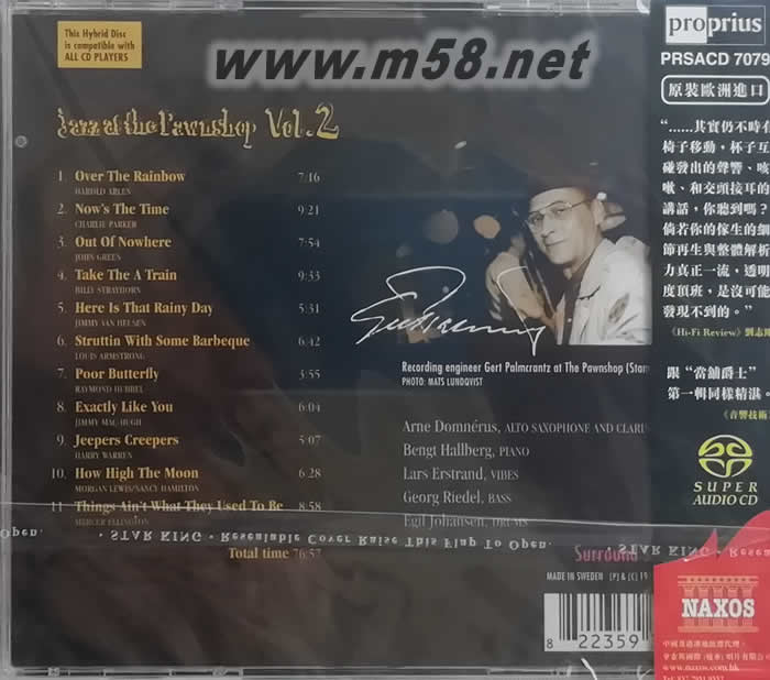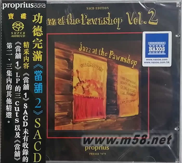 JAZZ AT THE PAWNSHOP 當(dāng)鋪爵士2 SACD(m58.net) 這張?jiān)侔娴腟ACD的封套很容易讓人產(chǎn)生錯(cuò)覺(jué),以為它就是之前再版過(guò)多次的經(jīng)典爵士樂(lè)錄音——《當(dāng)鋪爵士》。其實(shí)灌錄《當(dāng)鋪爵士》的樂(lè)手班底當(dāng)年錄制的樂(lè)曲,在PROPRIUS公司是分為前后三輯唱片出版的。如今這張?jiān)侔婕词堑?輯,但是唱片公司為了推廣上的考慮,改用了與著名的第1輯相同的封套圖案設(shè)計(jì)。《當(dāng)鋪爵士第2輯》和前作的音樂(lè)風(fēng)格幾乎是一致的,收錄的11首樂(lè)曲也大多是膾炙人口的標(biāo)準(zhǔn)曲,如《跨越彩虹》、《搭乘A號(hào)列車(chē)》、《這里恰逢陰雨天》、《月有多高》。瑞典爵士薩克斯老將多尼魯斯與鋼片琴高手厄斯查德依然是演出陣容中的主角,兩人精彩的獨(dú)奏與彼此應(yīng)答,為整個(gè)演出定立了基調(diào)。同樣地,《當(dāng)鋪爵士第2輯》也是絕頂發(fā)燒的LIVE錄音,尤其是經(jīng)過(guò)SACD技術(shù)翻制之后,4聲道的環(huán)繞格式增強(qiáng)了聆聽(tīng)的臨場(chǎng)感