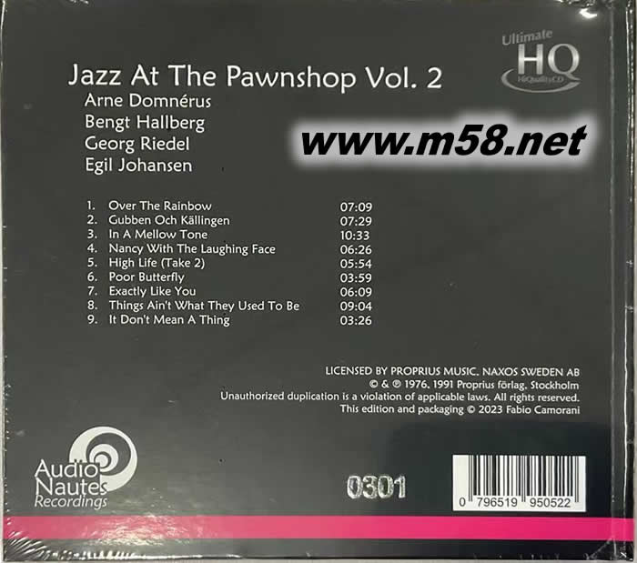 價格為估,以實到貨為準! 當鋪爵士2 JAZZ AT THE PAWNSHOP 2 UHQCD 限量版(m58.net) 爵士當鋪第一集風光唱片市場許久之後,爵士當鋪第二集一上市立刻又獲得滿堂彩,其實這都是1976年兩個寒冷的冬夜,在斯德哥爾摩舊城區的Stampen爵士俱樂部所錄製的。 錄音師Gert Palmcrantz躲在小廚房中,以簡單的器材捕捉舞臺上的精彩演出,場內煙霧瀰漫,酒氣撲鼻,處處洋溢著慵懶鬆散氣氛。這張錄音不但將薩克斯風肉感的金屬味,顫音琴迷人的共鳴,鋼琴清脆的跳躍清楚呈現,最主要是臨場感濃郁,聆聽者彷彿坐在圓桌旁,夾雜著威士忌的辛辣與咖啡的香醇,演奏者就在眼前忘情的把玩音樂。為了這樣的音樂,即使進當鋪也再所不惜,足見本片的吸引力。
