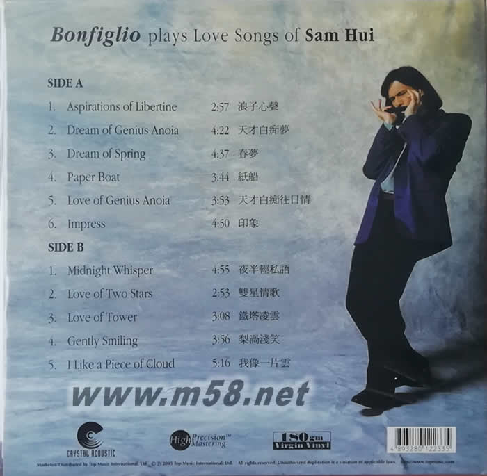 邦菲利奧口琴 情迷許冠杰(黑膠)(m58.net) 羅伯特.邦菲利奧這個(gè)名字,相信老資格的發(fā)燒友是不會(huì)陌生的。這位神乎其技的美國口琴演奏家有「吹口琴的Kenny G」的美譽(yù)。無論是古典風(fēng)格的名曲還是意境浪漫的情調(diào)作品,他的演繹,都顯得「得心應(yīng)口」,悠揚(yáng)悅耳,能展現(xiàn)出最優(yōu)雅迷人的味道來。除了技巧出眾,音樂令人陶醉,邦菲利奧的每張唱片都有極出色的錄音效果相佐,音色奇美,空氣感更堪稱示范級。因此,當(dāng)年誰若沒有聽過它的《紫口琴》、《藍(lán)口琴》等唱片,簡直愧戴「發(fā)燒友」這頂帽子,家里的音響也多少失去了自娛娛人的價(jià)值。 聽邦菲利奧的口琴音樂,不需要很高分貝的音量,就可以感受逸品般的精緻和美妙。在電子合成器波浪狀的音色陪伴下,口琴與小提琴展開了絕美的對話,婉約流暢的旋律恰似雨后初晴的天空,隱約一道彩虹飛過,令人心曠神怡。 經(jīng)典流行老歌由口琴吹出主旋律,一把木吉他彈撥和弦,不經(jīng)意中流露一份悠然的灑脫和浪漫,絕對是午夜未眠人的最好陪伴。錄音的細(xì)膩度和結(jié)像力一流,高級的音響系統(tǒng)甚至可以清晰還原出口琴簧片的質(zhì)感,和吉他手的手指擦弦聲,纖毫畢現(xiàn)!