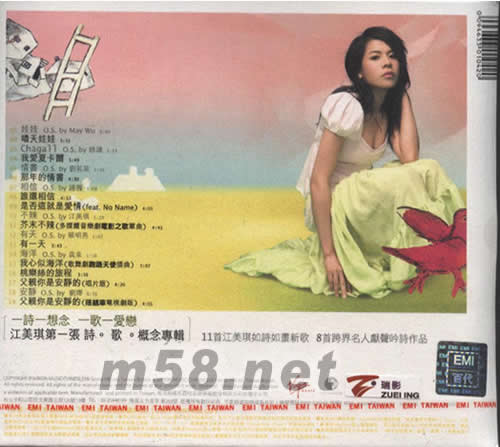 戀人心中有一首詩(m58.net) 已經(jīng)是情歌代名詞的江美琪,最新專輯「戀人心中有一首詩」,概念來自每一個戀愛中的人都敏感纖細(xì)、多愁善感,像是一個詩人。 在專輯中,除了收錄11首歌之外,我們特別邀請8位名人化聲為詩人,用各具特色的聲音吟念專輯中的歌詞,收錄在每一首歌之前。 這份超級卡司的名單,包括劉若英、蔡明亮、姚謙、劉燁、趙薇、May Wu(伍思凱女兒)、袁泉及小美自己。 他們各自選出他們最有感覺的歌詞來念,再分別加上不同的背景聲音,和小美的11首歌一氣呵成聽下來,為專輯營造出滿滿的詩意的氣氛! 首波推薦,「那年的情書」 ----姚謙作詞,陳國華作曲。江美琪再次演繹歌壇最美情歌 第二首推薦,「我愛夏卡爾」 ----帶著童話色彩的歌詞很有一種「小美異想世界」的氣氛。江美琪首度挑戰(zhàn)踢踏舞! 第三首推薦,「是否這就是愛情」 ----江美琪+No Name,兩大情歌唱將首度對唱,輕快曲風(fēng)讓你一聽就朗朗上口 第四首推薦,「芥末不辣」 ----音樂教父李宗盛點名合作 傾力制作,輕搖滾的江美琪一樣很動聽 第五首推薦,「我心似海洋」 ----詢問度最高,賣座歌舞劇《跑路天使》主題曲,江美琪的歌聲溫柔卻很有力量