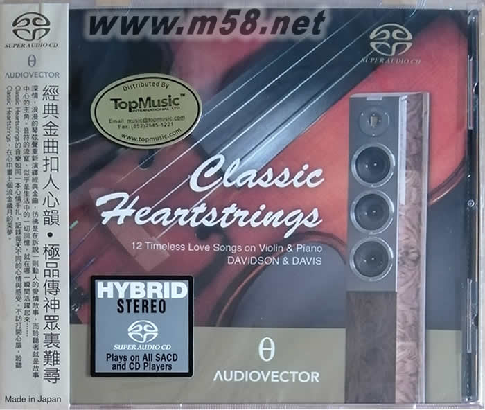 經典金曲扣人心韻 CLASSIC HEARTSTRINGS 12 TIMELESS LOVE SONGS ON VIOLIN PIANO 小提琴與鋼琴 SACD(m58.net) 經典金曲扣人心韻。極致傳神眾里難尋 深情、浪漫、的琴弦聲重新演繹經典金曲,仿佛是在訴說一則動人的愛情故事,而聆聽者就是故事中心主角。音符的流竄,似乎是生活中的一切回憶,就是在那一瞬間活躍起來 經典心弦》(Classic Heartstrings)金榜Canton發燒測試碟,12首永恒愛情歌曲,小提琴與鋼琴經典集,其美妙嫵媚、纖細委婉的弦音輕輕撥動起你的思緒,給人以美好溫暖的期待,凝煉出段段深情。款款的琴聲,給人以甜蜜溫馨的回憶!如泣如訴的小提琴,輕輕拉出細膩多姿的音樂;浪漫深沉的鋼琴,音色晶瑩剔透,明亮如歌,和著旋律,渾然一體,如癡如醉。 Canton揚聲器秉承做“最純粹音樂”的價值理念,聯手香港天樂唱片(Top Music)錄制的這張小提琴與鋼琴器樂專輯,堪稱經典。音樂表達出的真摯、溫暖、寧靜的意境,內斂而有力度。SACD音質的溫潤度、聲音的空靈感、信噪比和失真度都極小,讓每一位愛樂者在聆聽時完全沉入純粹的音樂空間里盡情徜徉。