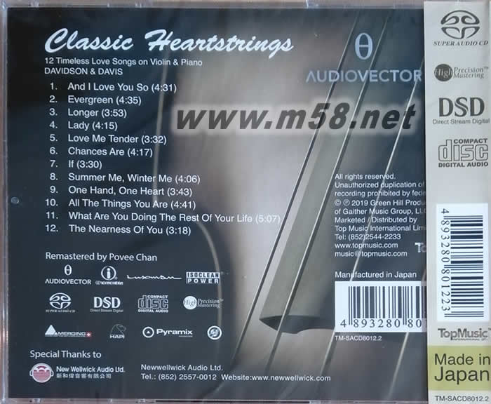經典金曲扣人心韻 CLASSIC HEARTSTRINGS 12 TIMELESS LOVE SONGS ON VIOLIN PIANO 小提琴與鋼琴 SACD專輯背面圖片