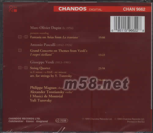 MARC-OLIVIER DUPIN(B.1954) PREMIERE RECORDING 1-6.FANTASIA ON ARIAS FROM LA TRAVIATA ANTONIO PASCULLI (1842-1924) 7.GRAND CONCERTO ON THEMES FROM VERDI'S I UESPRI SICILIANI GIUSEPPE VERDI (1813-1901) 8-11.STRING QUARTET IN E MINOR·E-MOLL ·MI MINEUR ARR.FOR STRINGS BY Y.TUROVSKY