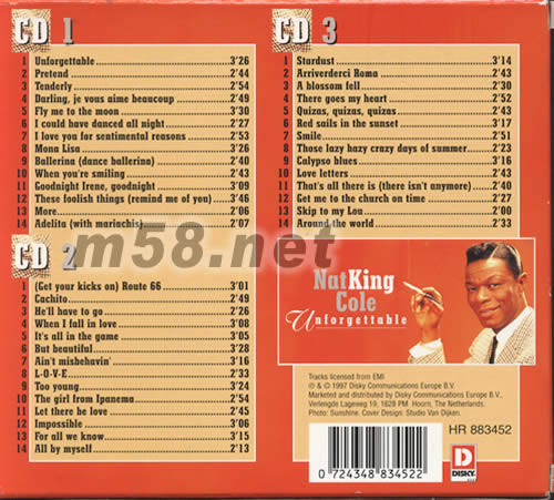 CD1 1、UNFORGETTABLE 2、PRETEND 3、TENDERLY 4、DARLING,JE VOUS AIME BEUUCOUP 5、FLY ME TO THE MOON 6、L COULD HAVE DANCED ALL NIGHT 7、I LOVE YOU FOR SENTIMENTAL REASONS 8、MONA LISA 9、BULLERINA(DANCE BALLERINA) 10、WHEN YOU’RE SMILING 11、GOODNIGHT IRENE,GOODNIGHT 12、THESE FOOLISH THINGS(REMIND ME OF YOU) 13、MORE 14、ADELITA(WITH MARIACHIS) CD2 1、(GET YOUR KICKS ON)ROUTE66 2、CACHITO 3、HE'll HAVE TO GO 4、WHEN I FALL IN LOVE 5、IT‘S ALL IN THE GAME 6、BUT BEAUTIFUL 7、AIN’T MISBEHAVIN‘ 8、L-O-V-E 9、TOO YOUNG 10、THE GIRL FROM IPANEMA 11、LET THERE BE LOVE 12、IMPOSSIBLE 13、FOR ALL WE KNOW 14、ALL BY MYSELF CD 3 1、STARDUST 2、ARRIVERDERCI ROMA 3、A BLOSSOM FELL 4、THERE GOES MY HEART 5、QUIZAS,QUIZAS,QUIZAS 6、RED SAILS IN THE SUNDET 7、SMILE 8、THOSE IUZY HAZY DAYS OF SUMMER 9、CALYPSE BLUES 10、LOVE LETTERS 11、THAT’S ALL THERE IS (THERE ISN‘T ANYMORE) 12、GET ME TO THE CHURCH ON TIME 13、SKIP TO MY LOU 14、AROUND THE WORLD