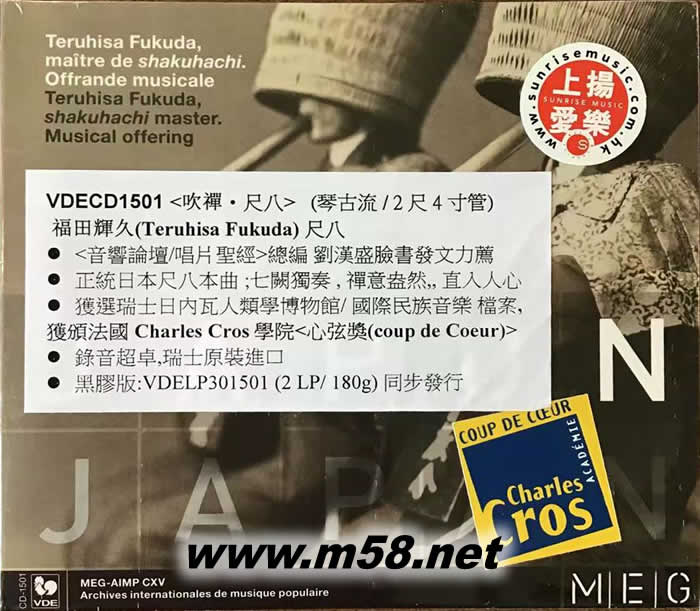 吹禪 尺八(m58.net) 正統日本尺八名演, 獲選入瑞士日內瓦人類學博物館/ 國際民族音樂 檔案; 獲頒法國Academie Charles Cros學院<心弦獎(coup de Coeur)> 七闕獨奏 , 禪意盎然, 直入人心 錄音超卓,瑞士原裝進口