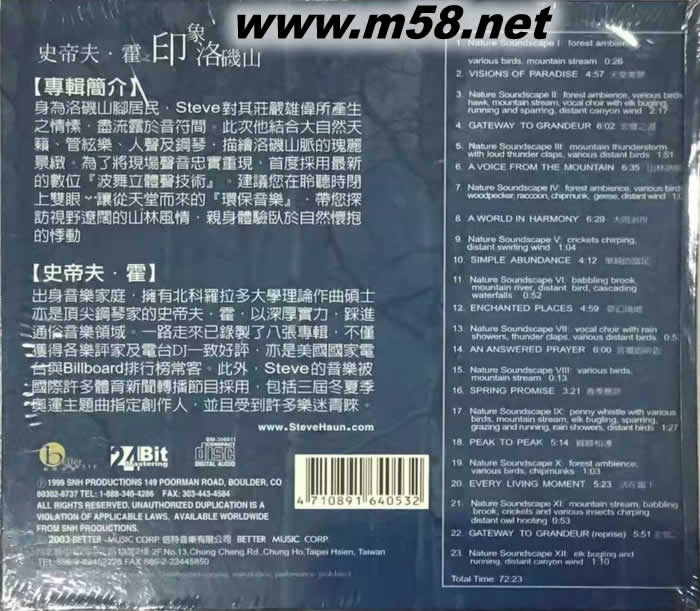 印象洛磯山 JMPRESSIONS OF THE ROCKY MOUNTAINS(m58.net) 三屆奧運主題曲創作人-新世紀音樂 國際著名錄音師、鋼琴家、作曲家、編曲家、監制、頂級運動音樂創作人是當今音樂人中極具個性、并能夠自由游走于新式成人現代輕器樂和節拍易記的現代爵士樂的佼佼者。清新、透明、無憂、自然、幻夢。輕盈琴韻與清新樂聲,是伊甸園的快樂精靈,穿過林間的晨曦,鋪陳出一條清幽小徑,牽引你的思緒、給你透明心情,走進清晨的伊甸園. 世界頂級運動音樂的創作人和音樂家的 Steve Haun 是從其Boulder的家鄉Colorado名聲鵲起的。初始,一家名叫Denver的電視臺對他做了一個專訪,馬上,地方電視臺的新聞報道節目就開始用他的音樂來編配自己的新聞。他的音樂還經常被用于地方——而后是全美的廣告節目。接著在Coors古典自行車競賽、國際高爾夫循環賽上都能聽到他的音樂了。地方和全國電視臺、電臺轉播年度 Bolder Boulder(全美最大規模的10公里田徑項目,馬拉松賽事的一種)新聞報道時,還采用了他的作品作為活動的專用曲目。1992年,他為上述賽事譜寫了官方主題曲,而這些音樂,就為隨后的《Victory》專輯打下了基礎。 在過去的歲月中,Steve Haun 的音樂被用于NBC電臺的《Sportsworld》、大學生足球以及全國足球聯賽(包括Heisman 大獎賽開幕式以及NFL總決賽)、全國籃球聯賽(包括全明星賽、總決賽以及NBA總決賽)、美國 ESPN 全美循環賽系列、網球賽(美國網球公開賽、法國公開賽、溫布爾登網球公開賽、RCA網球錦標賽以及馬自達經典網球賽事)、世界花式滑冰大獎賽、職業沙灘排球賽、Michael Jordan 高爾夫賽、Ryder杯、1992年夏季和1994年冬季奧運會。這些音樂有的是他專輯中的現有曲目,當然,也有一部分是他被特聘為這些賽事專程創作的。如一首名為《Philadelphia Eagles》的曲目,即是為了逢雙周播放的電視體育show專門創作。 為體育廣播、show創作歌曲,Steve Haun 贏得了不絕于耳的贊美。他對各種賽事帶給人的不同感覺——振奮人心、磅礴恢弘、極富節奏、充滿力量、勝利的狂喜和失敗的悲痛——捕捉能力驚人。Steve Haun 將自己的能力歸于在他成長的過程中強烈的吸引他興趣的兩樣事物。這兩樣事物,音樂和運動當之無愧。