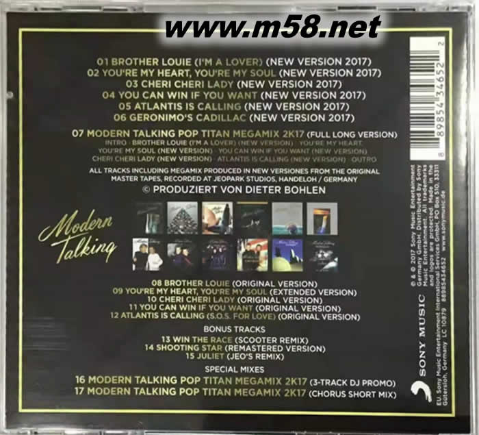 摩登語錄 BACK FOR GOLD(m58.net) 摩登語錄80年代德國著名流行組合MODERN TALKING CD The New Versions,收錄1989年經典專輯 大熱歌曲,並重新混音灌錄 摩登淘金合唱團,德國男子音樂組合, 由Thomas Anders和Dieter Bohlen兩位成員組成,1984年推出的首支單曲《You're My Heart, You're My Soul》。代表作有《You're My Heart, You're My Soul》、《Cheri Cheri Lady》、《You Can Win If You Want》、《Brother Louie》等。