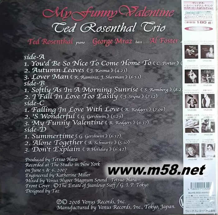我為人人樂團(tuán):情事的盡頭MY FUNNY VALENTINE 爵士三重奏 (鋼琴、大提琴、鼓) 雙黑膠(m58.net) Ted Rosenthal - piano George Mraz - bass Al Foster - drums 歌后海倫瑪芮爾最受歡迎的曲目,由合作多年的伴奏泰德羅森修擔(dān)綱演奏,優(yōu)美的琴音帶你重溫一首又一首的經(jīng)典。 1930年出生于紐約的海倫瑪芮爾(Helen Merrill)是最受日本聽眾喜愛的爵士歌手,1954年第一張專輯即由樂壇教父Quincy Jones制作,之后推出了超過四十張的爵士專輯。海倫瑪芮爾的特殊之處不僅在于她是當(dāng)時(shí)爵士樂界少有的白人歌手,更在于她之后在歐洲、日本長(zhǎng)住的歌唱生涯。在這兩個(gè)地方,她都繼續(xù)灌錄唱片,至今她仍然每年在這兩地舉辦巡迴演唱。也因此,日本聽眾對(duì)于這位歌手有著特殊的情感。 科班出身,曾經(jīng)獲得塞隆尼斯夢(mèng)克鋼琴大賽首獎(jiǎng)的泰德羅森修從1996年之后長(zhǎng)期擔(dān)任海倫瑪芮爾巡迴演唱樂隊(duì)的鋼琴手,因此當(dāng)要在Venus灌錄第二張專輯時(shí),唱片公司提出了演奏她暢銷曲的要求。這對(duì)泰德羅森修來說當(dāng)然易如反掌,而且他還有默契絕佳,一樣是伴奏樂隊(duì)長(zhǎng)期班底的貝斯手喬治馬拉斯一同演出。鼓手方面則是爵士樂界的傳奇人物,曾與邁爾斯戴維斯合作超過十三年的艾爾佛斯特。這位鼓手在爵士樂界合作過的人物簡(jiǎn)直就是爵士名人錄,替這個(gè)三重奏加分不少。 選曲方面,不僅是海倫瑪芮爾的歌迷,就算是一般爵士樂迷對(duì)這些標(biāo)準(zhǔn)曲目也是耳熟能詳。選錄了羅杰斯、蓋西文的作品各兩曲,還有柯爾波特的“You'd Be So Nice To Come Home To”、比莉哈樂黛的“Don't Explain”,以及爵士樂中有著近乎國(guó)歌地位的“Autumn Leaves”。泰德羅森修的鋼琴演奏既尊重原始的旋律,又帶著品味極高的即興成份,而鼓手與貝斯手總能適度的在樂曲中間填補(bǔ),讓音樂聽起來豐富而充滿趣味。尤其是艾爾佛斯特的鼓,即使在極慢板歌曲中也有精彩繁複的演奏,聽來相當(dāng)引人入勝。 建議聆聽“Softly As In A Morning Sunrise”,中間有精彩的貝斯獨(dú)奏,而最后鋼琴與鼓再來上一段精彩應(yīng)對(duì),可說將三人的技巧發(fā)揮到淋漓盡致。既有著選曲上的通俗流行性,又有著爵士樂該有的深度與趣味,這是一張值得收藏、長(zhǎng)期聆賞的專輯,無(wú)怪乎唱片一推出就獲得Swing Journal雜志的金唱片推薦。 在錄音方面,本張專輯維持Venus的傳統(tǒng),在紐約The Studio進(jìn)行錄制,三樣樂器都有極為傳真的音質(zhì),自然的空間殘響與樂手細(xì)微的動(dòng)作都能精彩的捕捉,加上Venus獨(dú)家的混音與母帶處理技術(shù),聽來宛如置身樂手面前,是示范等級(jí)的音響?zhàn)嬔纭?br>