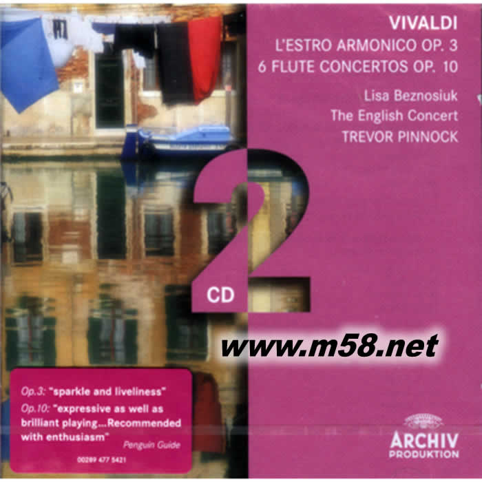 維瓦爾第:和諧的靈感Vivaldi:L'estro armonico 雙CD(m58.net) 由特雷沃•平諾克指揮英國音樂會樂團演奏的《維瓦爾第:和諧的靈感》,2009年的《企鵝古典唱片指南》中推薦為三星。 維瓦爾第在作曲方面所涉獵的音樂形式繁多,但人們公認他為巴洛克協奏曲領域的王者之一,維瓦爾第諸多創作中流傳至今的重要作品也以這類協奏曲居多。據統計,他一生總共寫作了400多首協奏曲,其中包括獨奏協奏曲和管弦樂協奏曲(兩者的區別在于前者為突出獨立的樂器而作,后者則是專為管弦樂團或合奏團譜寫的)。這些作品充分體現出維瓦爾第的音樂天賦,從中我們可以聽到鮮活的旋律、熱情的節奏、華麗的音色以及令人感到意外的音樂主題和對比變化,可以說這些協奏曲充分體現出了巴洛克音樂的特色。另外他還將巴洛克協奏曲三個樂章的組成定型為“快-慢-快”的變化方式,成為了同類作品中的典范(當然也有例外,維瓦爾第自己的創作中就有兩樂章或四樂章的協奏曲)。在其眾多作品里,有三組協奏曲(每組十二首)最為人們所熟悉——《和諧的靈感 Op.3》、《異乎尋常 Op.4》以及《和聲與創意的實驗 Op.8》。 英國本土古樂指揮大師特雷沃•平諾克(Trevor Pinnock)與他親手創立的英國音樂會樂團所演繹的巴洛克作品在專業評論界是擁有極高評價的。平諾克對古樂深厚的研究以及英國音樂會樂團清澈、明快的音色,在唱片中顯露無遺。 平諾克與英國音樂會樂團的合作,被認為是二十世紀后半最佳的古樂器(Period Instruments)演奏組合。平諾克極為敏銳的洞察力,以及深入的研究考證,使得整個演奏極具說服力。這款錄音以數碼方式錄制,音響效果更是杰出,是聆賞維瓦爾第這部《和諧的靈感》不可或缺的版本。