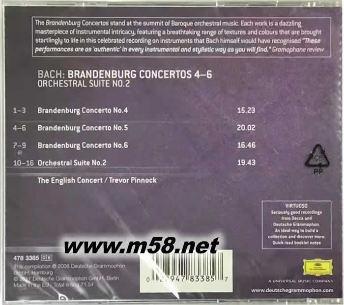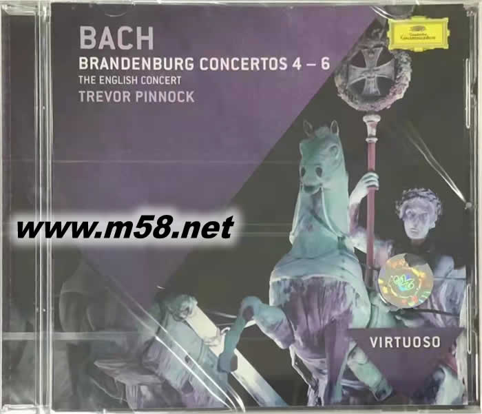平諾克指揮 - 巴赫 布蘭登堡協奏曲第4-6號 VIRTUOSO大師系列(m58.net) 巴哈:布蘭登堡協奏曲第四至六號;第二號管弦樂組曲 ☆平諾克指揮/英國協奏團 巴哈在柯登擔任奧柏雷親王樂長時期寫下大提琴無伴奏組曲、六首《布蘭登堡協奏曲》以及無伴奏小提琴奏鳴曲與組曲等重要作品。《布蘭登堡協奏曲》是巴哈在1721年獻給布蘭登堡領主魯德維的作品,與管弦樂組曲並列巴哈的兩大通俗之作。樂曲融合了活潑、音樂的歌唱性與樂器間的對比色彩,可說是已經具備了交響曲的初步雛型。 管弦樂組曲是以當時歌劇序曲為創作范例,而這類歌劇序曲原為路易十四的宮廷制定,與凡爾賽宮、太陽神的權利有關,所以以表現皇室的莊嚴為特徵。第二號管弦樂組曲創作於1721年左右,演奏編制是樂團與長笛獨奏,像是一首長笛協奏曲。 平諾克與英國協奏團以古樂器演奏的《布蘭登堡協奏曲》,曾經被「企鵝評鑑」譽為代表「平諾克所提倡的仿古演奏巔峰」。它的聲音清晰而且充滿活力,弦樂的聲音甜美溫暖,聽不出有任何刻意鑿刻的痕跡。第二號管弦樂組曲著名的長笛獨奏段落速度快但是輝煌,分句有力,因此感染力非常強烈。