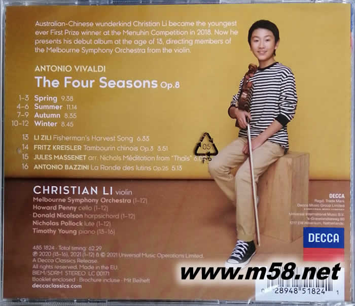 小提琴 神童THE FOUR SEASONS 四季(m58.net) 現(xiàn)年(2021)僅13歲的天才小提琴家李映衡(Chirstian Li)已經(jīng)擁有多項(xiàng)傲人的成就:10歲贏得世界頂尖的曼紐因國(guó)際小提琴比賽少年組第一名,為該賽自1983年創(chuàng)辦以來(lái)最年輕的首獎(jiǎng)得主。2020年與DECCA唱片簽約合作,為DECCA自1929年成立以來(lái)最年輕的專(zhuān)屬音樂(lè)家,更在2021年成為有史以來(lái)錄製韋瓦第《四季》小提琴協(xié)奏曲最年輕的小提琴家。 李映衡2007年出生於澳大利亞墨爾本,父親是電子工程師,母親為會(huì)計(jì)師。5歲開(kāi)始學(xué)習(xí)小提琴即展現(xiàn)音樂(lè)天賦,7歲時(shí)師事墨爾本澳大利亞國(guó)立音樂(lè)學(xué)院(Australian National Music Academy)著名小提琴家羅賓·威爾遜博士(Dr. Robin Wilson);2014年參加中國(guó)「金色北京小提琴比賽」獲得一等獎(jiǎng)。2015年加入墨爾本弦樂(lè)團(tuán)(Melbourne String Ensemble),成為有史以來(lái)年齡最小的樂(lè)團(tuán)成員。2017年7月獲得義大利青年藝術(shù)家Semper音樂(lè)國(guó)際大賽小提琴組一等獎(jiǎng),並被選中在紐約卡耐基音樂(lè)廳參加美國(guó)藝術(shù)家音樂(lè)展示10周年音樂(lè)會(huì);2018年贏得曼紐因國(guó)際小提琴比賽后便朝專(zhuān)業(yè)小提琴家舞臺(tái)邁進(jìn)。 在這張「神童四季」專(zhuān)輯中,李映衡不僅擔(dān)任小提琴獨(dú)奏,同時(shí)還指揮墨爾本交響樂(lè)團(tuán)協(xié)奏這部有史以來(lái)最受喜愛(ài)的古典名作:《四季》小提琴協(xié)奏曲,而他在曼紐因大賽中的演奏曲目便包括其中的「夏」。此外,專(zhuān)輯還收錄中國(guó)作曲家李自立的《豐收漁歌》、克萊斯勒的《中國(guó)花鼓》、馬斯奈《泰伊思瞑想曲》,以及巴齊尼的《精靈輪旋曲》。之所以選擇中國(guó)作品《豐收漁歌》,李映衡表示:「因?yàn)橥高^(guò)它可以將音樂(lè)與我的中國(guó)血統(tǒng)相連。這首作品描繪漁民出海打漁返回村莊時(shí)喜悅的情緒,很高興可以藉由小提琴來(lái)傳達(dá)樂(lè)曲中人物的心情。」 李映衡發(fā)自?xún)?nèi)心熱愛(ài)小提琴,他說(shuō):「我喜歡在觀眾面前表演,那種感覺(jué)就像是在對(duì)他們講述一個(gè)故事,我可以把情感傳遞給觀眾,而我也因此越來(lái)越熱愛(ài)小提琴。」藉由首張專(zhuān)輯的發(fā)行,李映衡一躍成為國(guó)際樂(lè)壇矚目的新星。他以非常成熟的音樂(lè)才能和詮釋方法配合與生俱來(lái)的音樂(lè)熱情,這位鼓舞人心的年輕音樂(lè)家無(wú)疑為自己開(kāi)闢了充滿(mǎn)希望的未來(lái)。