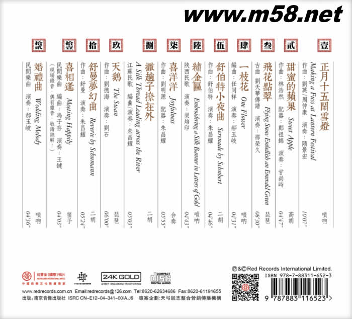 飛花點翠 國樂寶典 ( 嗩吶、高胡、琵琶、二胡) 24K GOLD CD 金碟(m58.net) 緣起 瑟瑟江天,煙雨濛濛,長汀水榭,花葉紛飛。古樂聲里音容淡,草樹堤邊萬年消。 為您揭開華夏文明古國音樂的神秘面紗,見證音樂史上最偉大的錄音製作,數(shù)十位國手大家合璧聯(lián)袂嘔心瀝血製作,一統(tǒng)中國音樂之精華 開創(chuàng)無限發(fā)燒新視野。 『國樂寶典』系列唱片為當年才有模擬錄音技術(shù)的開盤母帶進行高動態(tài)多細節(jié)的頂級重製;以中國傳統(tǒng)樂器為主奏樂器,中西結(jié)合,國樂交響化的整體編曲配樂風格,使得原本傳統(tǒng)的民族音樂呈現(xiàn)出恢弘景致。『國樂寶典』全套系列唱片,由國樂大師朱昌耀、俞遜發(fā)、陸春齡、王次恒、劉德海、任同祥、蘇宇虹等領(lǐng)銜;由中國江蘇省民族樂團、上海交響樂團等頂級樂團共同協(xié)奏中國古今民樂中流傳千古、聲勢赫赫的民樂華章,實為中樂大餐。為尊重當年錄音質(zhì)量、不修飾、不增加聲音內(nèi)容、力求做到全部原音重現(xiàn)。製作商採用當今世界上最先進的A/D數(shù)字轉(zhuǎn)換,盡可能的將那最原汁原味的美好聲音還原到極致。簡單地說,它的精神就是保證『原音重現(xiàn)』。在母帶的處理上,我們的製作群這次特別邀請了德國金耳朵工作室的首席錄音師來進行。耗盡心血將這些技術(shù)提高到能將聲音鮮活地保存到CD的水準上。以發(fā)燒天碟的高標準要求進行后期錄音製作,可徹底測試音響器材的真正實力。清晰透明的音場感,每一件樂器的音色精細無疑和像真的效果,均是錄音的優(yōu)點。 德國錄音室找到辦法從空氣中捕捉到歷史上的演奏。監(jiān)聽這全套CD時,我們將它與原先早期版本做了比較。此次CD的動態(tài)與細節(jié)都比早期版本更好尤其是在動態(tài)方面,CD表現(xiàn)的更直接明快,給人一種聆聽錄音室母帶般的快感,之前製作的這全套老CD有一種特殊粗獷的氣氛,而此次CD在重製母盤后,則比較乾凈,溫暖柔和而不失細節(jié)。感謝二十一世界的科技,感謝它讓我們重溫最原汁原味的二十世紀最佳的錄音;感謝投資方對這整套非物質(zhì)文化遺產(chǎn)作品進行搶救性的製作,在時隔這么多年的今天讓我們再次聽到這么傳真、這么幸福的聲音。 歷史就是記憶,而記憶是需要某些容器和觸發(fā)物的。全套民樂的錄製,曲曲皆精彩,無一不是新中國音樂史上最偉大的製作。大師們的演奏勁力充沛,指腕柔韌,演奏一氣呵成。琴音清悅圓潤,樂聲飄逸跌蕩,韻味悠長,絕對是不可多得的演錄和試音天碟,極具收藏價值。