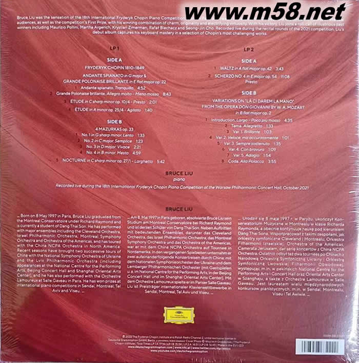 2021第18屆國際蕭邦鋼琴比賽冠軍現場 CHOPIN 18th International Chopin Piano Competition 黑膠(m58.net) 2021蕭邦國際鋼琴比賽冠軍輯 這個現場錄音,將劉曉禹詮釋蕭邦的音樂觸感,完全真實的呈現。這個演出也將是近年的蕭邦經典錄音首選。 劉曉禹的演奏自然流暢,高貴,毫不做作,還有比常人敏感數倍的節奏感。對音色的把控驚人,彈奏舞曲時跟著舞動的腳,高高翹起的小指,都與音樂融為一體。180克雙黑膠