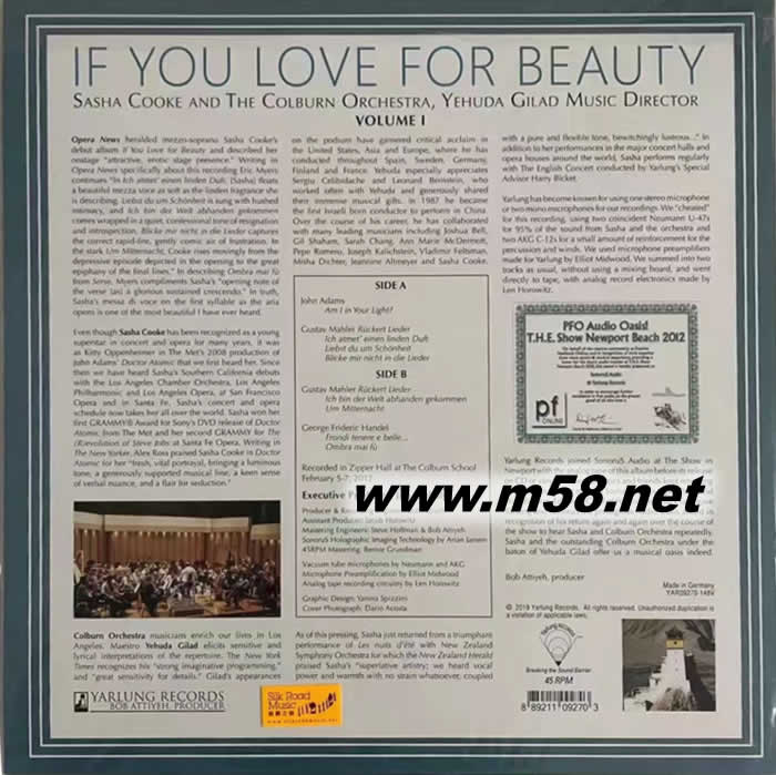 若你因美麗而愛 第1輯 If You Love For Beauty Vol.1 45轉(zhuǎn) 黑膠(m58.net) 莎夏.庫克《若你因美麗而愛》LP兩度格萊美大獎,被譽為現(xiàn)今最杰出和前途無限的女中音歌唱家莎夏.庫克以明艷亮澤的音色,清脆豐厚的聲線,情深細致地唱出亞當(dāng)斯、亨德爾及馬勒等人作品。45轉(zhuǎn)黑膠聲樂演唱示范盤之一。 1. 曾兩度獲得格萊美大獎(Grammy Award),被譽為現(xiàn)今最杰出和前途無限的女中音歌唱家莎夏.庫克(Sasha Cooke)以明艷亮澤的音色,清脆豐厚的聲線,演唱曲目非常廣泛,感情滿溢的歌唱嬴得不少樂迷的傾注,她這些令人欽羨的天份在她的最新專輯《若你因美麗而愛(If You Love For Beauty)》表露無遺。 2. 由大師級單簧管演奏家耶胡達.吉拉德(Yehuda Gilad)於2003年在位於美國洛杉磯著名柯爾本音樂學(xué)院(Colnurn Conservatory of Music)創(chuàng)立的「柯爾本管弦樂團」被當(dāng)代著名指揮家杰拉德‧施瓦茨(Gerard Schwarz)推許為”毫無疑問是世界上最好的樂團之一”,雖然絕大部份成員是該校學(xué)生,但他們都是天資聰穎,具有成為明日之星的潛能,加上吉拉德與團員心領(lǐng)神會的默契,欣賞他們的演奏誠然是賞心樂事。