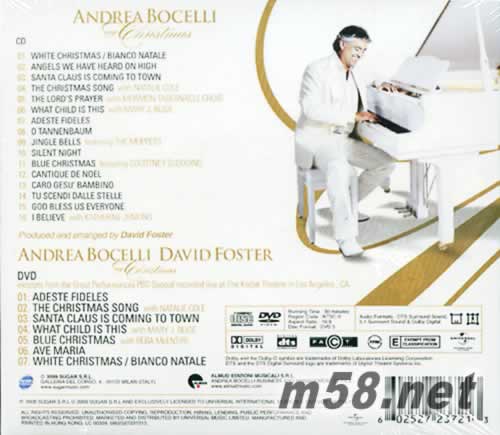CD 01. White Christmas/Bianco Natale 02. Angels We Have Heard On High 03. Santa Claus Is Coming To Town 04. The Christmas Song with Natalie Cole 05. The Lord's Prayer with The Mormon Tabernacle Choir 06. What Child Is This with Mary J. Blige 07. Adeste Fideles 08. O Tannenbaum 09. Jingle Bells featuring The Muppets 10. Silent Night 11. Blue Christmas with Reba McEntire 12. Cantique De Noel 13. Caro Gesu Bambino 14. Tu Scendi Dalle Stelle 15. God Bless Us Everyone 16. I Believe with Katherine Jenkins DVD 01. Adeste Fidelies 02. The Christmas Song (with Natalie Cole) 03. Santa Claus is Coming to Town 04. What Child is This (with Mary J. Blige) 05. Blue Christmas (with Reba McEntire) 06. Ave Maria 07. White Christmas / Bianco Natale