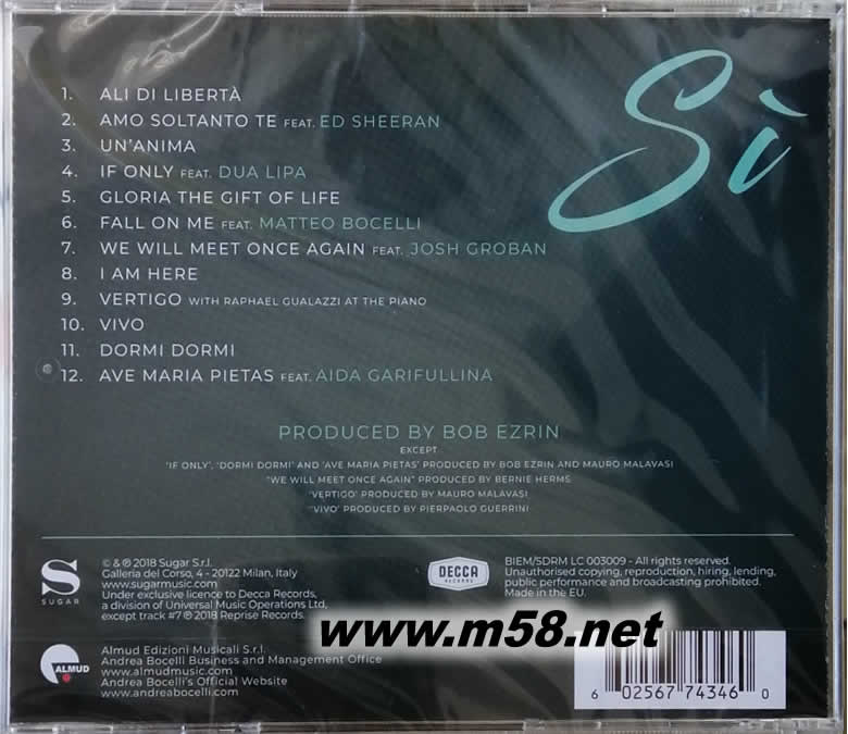 Andrea Bocelli Si 真好(m58.net) 媲美上帝美聲 史上第一跨界男高音睽違14年全新原創大碟 ★一次集結當今樂壇最強陣容 紅髮艾德、杜娃黎波、喬許等完美呈現 ★收錄打破流行古典MV點擊紀錄,與兒子Matteo Bocelli深情合唱《胡桃鉗與奇幻四國》電影片尾曲"Fall On Me";繼"Time To Say Goodbye"后,原班人馬再造世紀絕響"If Only"與樂壇天后aMEI跨國對唱 ● 關於專輯【Sì】:意思與英文的Yes相同,Andrea Bocelli笑說那是兒子Amos想到的「我們太常説No了,Yes就像是當你想要讓別人感受到好心情時會說的一個字,也是當你有著美好時光時會說的一個字!Sì是一個表達正面,充滿力量與人性的字,很有感覺,充滿情感的字?!?br>2004年,有著媲美上帝美聲的安德烈波伽利Andrea Bocelli發行了專輯【Andrea】並受到全球樂迷熱烈迴響,隔年他便受邀在梵蒂岡在天主教教宗前獻唱,之后更陸續在世界各地如冬季奧運閉幕典禮、美國總統歐巴馬的圣誕音樂會、上海世界博覽會開幕典禮、國際足總世界盃決賽,甚至今年的英國皇家婚禮上,都能聽見Andrea Bocelli宛若天籟的歌聲。過去14年,他締造了超乎想像的傲人成就,這些豐功偉業替Andrea Bocelli在音樂之路上,集結了滿滿的能量。2018年,在歡慶他60歲大壽的同時,這張睽違14年的最新大碟【Sì】中每一首新曲也是他過去的心血累積與創作釋放。 回到23年前,Andrea Bocelli因與義大利創作組合Francesco Sartori、Lucio Quarantotto合作一曲"Time To Say Goodbye",讓他一舉成名並讓這首歌成為樂壇的曠世名作,如今Lucio的離去,這首同樣由黃金陣容所打造出的作品"If Only"也將成為世紀絕響,更難得是邀請到樂壇天后張惠妹aMEI跨國獻聲,為這張全新專輯打開最美好的序幕!同時間Bocelli也網羅了當今樂壇新生代的最強陣容,包括紅髮艾德Ed Sheeran、杜娃黎波Dua Lipa、喬許Josh Groban等,用不同的語言、曲風,與Bocelli一起用歌聲歌頌祝福,而專輯中最特別的是他與兒子Matteo Bocelli為迪士尼《胡桃鉗與奇幻四國》獻唱電影片尾曲"Fall On Me",完美的歌聲表現堪稱為明日之星。 曾經五度來華演唱的Andrea Bocelli以8000萬張銷量成為當代最暢銷古典樂藝人的頭銜,生涯榮獲7座英國古典音樂獎、7座世界音樂獎,並與席琳狄翁Céline Dion、史提夫汪達Stevie Wonder、亞莉安娜Ariana Grande、Plácido Domingo多明哥、José Carreras Coll卡列拉斯等同臺展現歌藝。【Sì】是一張歌頌愛、家庭、信仰與希望,傳遞音樂情感力量的專輯「我想要回到我是個在鋼琴酒吧彈唱的年輕人的回憶里,在那之后,我錄製了許多的專輯,重新詮釋了許多歌曲,做了不同領域的演出,我對自己說「也許是時候了,該是傾注我的全力去找新歌的時候了?!咕拖袷俏业母璩聵I全部重新開始一樣。」僅管Bocelli是全球享譽盛名的國際巨星,但他仍保持著令人尊敬的謙虛個性,就如同Sì在義大利語中,是個情緒強烈卻又簡潔的字眼,蘊含著決心、樂觀等意味,簡單卻充滿力量。